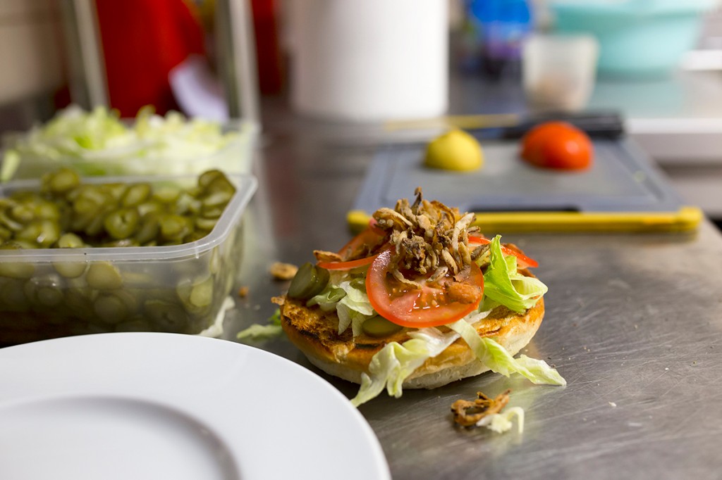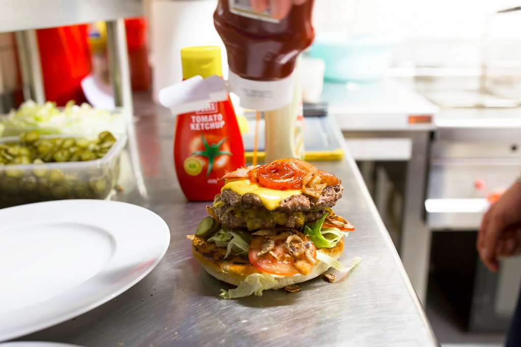 A buci megpirult, a hús elkészült, a marhára került egy-egy jó szelet cheddar is, mi pedig felkészültünk az összeszerelésre. Az adekvát szószok mellett saláta, uborka, paradicsom, és a roppanósság érdekében lyoni hagyma került a szendvicsek alá, mellé pedig sült krumplit kérhetünk köretnek, ami korrekt, mirelit fajta, de jelen pillanatban úgy döntöttünk Totyival, a fotósunkkal, hogy elég lesz ennyi is, örülünk, ha meg tudunk birkózni vele.