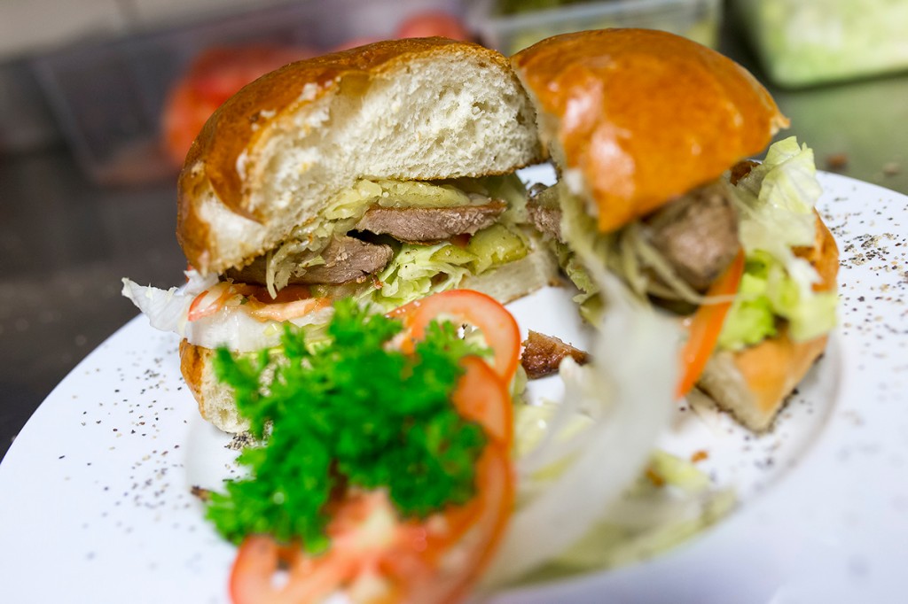 A másik burgernek a kacsát választottuk, itt egy rozmaringgal előfőzött mellhús került elő, melyet szeletekre vágva Laci kicsit lepirított a rostlapon, majd melléjük dobta a házi recept alapján készülő, fényes tetejű, vidáman mosolygó bucit. Azt is megtudtuk közben, hogy a törzsvendégek is előszeretettel rendelik már a burgereket, és igazából nem kivételeznek, mindegyiket ugyanolyan előnyben részesítik – már ha a felfalást lehet annak nevezni.
