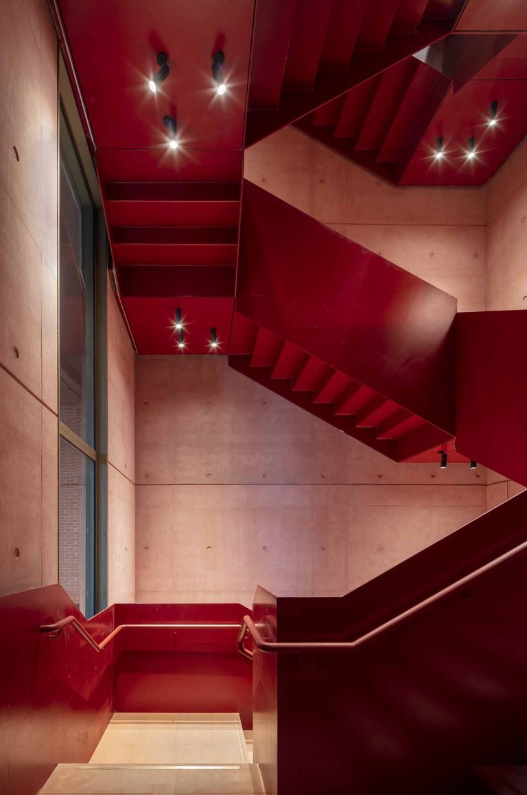 Szintén nyilvános tér a főutcáról nyíló bejárati oszlopcsarnok, ahol meccsnapokon összejöhetnek a szurkolók. A beton-vöröstégla szerkezet kézzelfogható kapcsolatot teremt az épület funkciójával, és kulcsfontosságú lesz a látogatói élmény szempontjából is.