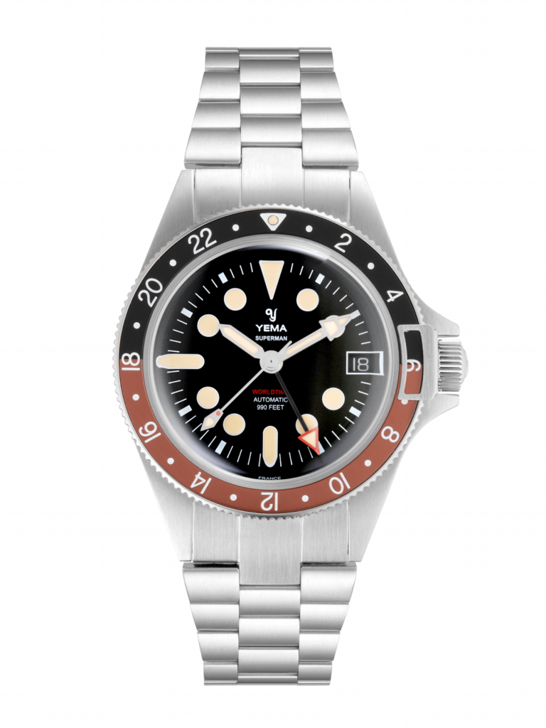 A Yema egy régi, francia márka, amelyet az elmúlt években élesztettek újjá. A brand azóta saját, házon belül készült szerkezeteket is kidolgozott, egy ilyen GMT-modullal rendelkező szerkezet ketyeg a Yema Superman Worldtime GMT-ben is. A nagy, mesterséges patinával ellátott indexek a régi maxi számlapos Submarinereket juttatja az emberek eszébe, a halvány lünetta pedig tovább erősíti az antik életérzést. A specifikációk terén közel sem vintázs ez az óra, a 300 méteres vízállóságával majdnem igazi búvárnak mondható.