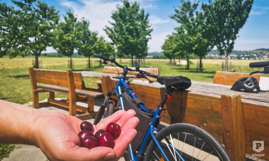 A második terven kívüli gasztroélményt egy olyan biciklispihenő adta, ahol a megfáradt bringásoknak többféle fajta cseresznyefát ültetett a figyelmes helyi turisztikai menedzsment.