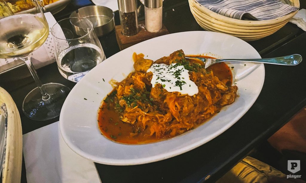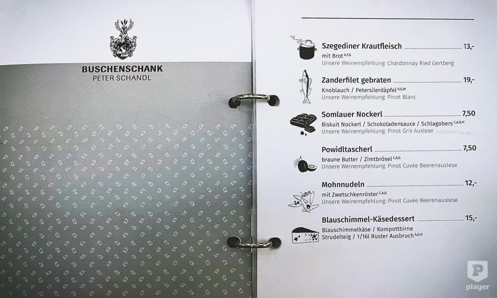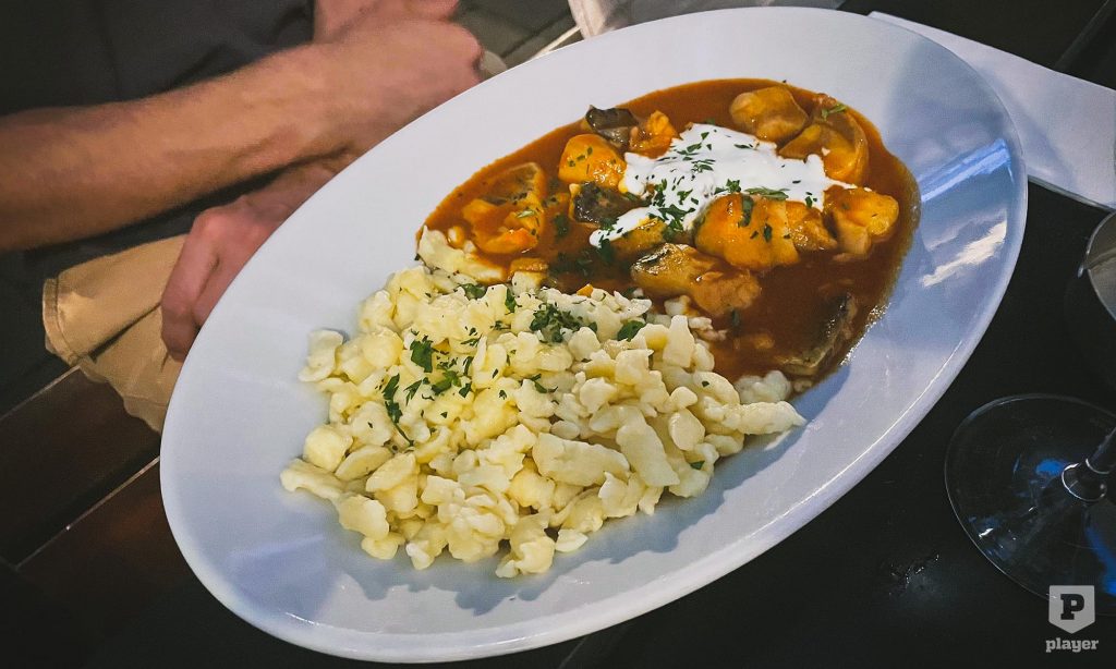 Barátságos vidéki hangulatú étterem egy belső udvarban. Minden pincér magyar, mint nagyjából 90%-ban mindenhol errefelé – nyelvi nehézségek nincsenek. Nyelvi érdekességek annál inkább, hiszen az étlapon olyan fogások szerepelnek, mint a Fischpaprikasch, a Szegediner Krautfleisch vagy a Somlauer Nockerl. Ezek után természetesen ügyet sem vetettem az autentikusabban hangzó dolgokra; naná, hogy osztrák szegedi húsoskáposztát és somlói galuskát rendeltem! Muszáj volt.