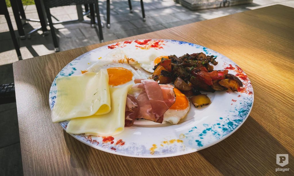 A kis hotel meglepően széles választékú büféreggelivel várt minket, nehogy már üres hassal induljanak el bringázni a vendégek. A tipikus minőségi szállodai kínálatból csak egy tételt emelnék ki: volt fügemustár a sajtokhoz! Jómagam ezt a sárgás, ikrás, bizsergetően csípős és mézesen édes holmit sajtok mellé már igen régóta kedvelem. Ha német nyelvterületen járok és van idő boltba menni, hozok is haza mindig egy-két üveggel. Két kollégám számára viszont újdonság volt ez a cucc. A sikerarány 50%-osnak tűnt; Tomi udvariasan nem beszélt a dologról többet, István viszont még le is fotózta a fügemustárral (Feigensenf néven tessenek keresni) körített reggeli sajttálacskáját, annyira tetszett neki a dolog: