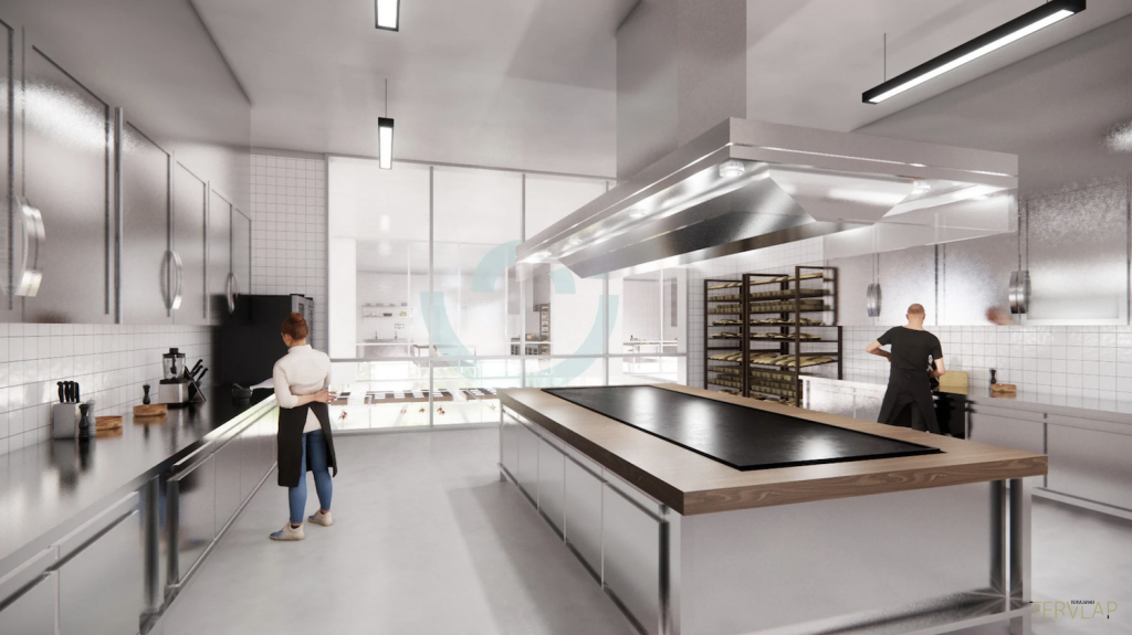 Azért csak szinte, mert a Portal Way nevű épület földszintje utcai árusokkal, kávézókkal zsúfolt közterület, ám felette több mint húszezer négyzetméteren kétszázhatvan konyhát terveztek, ahol ezerkétszáz ember dolgozik majd.