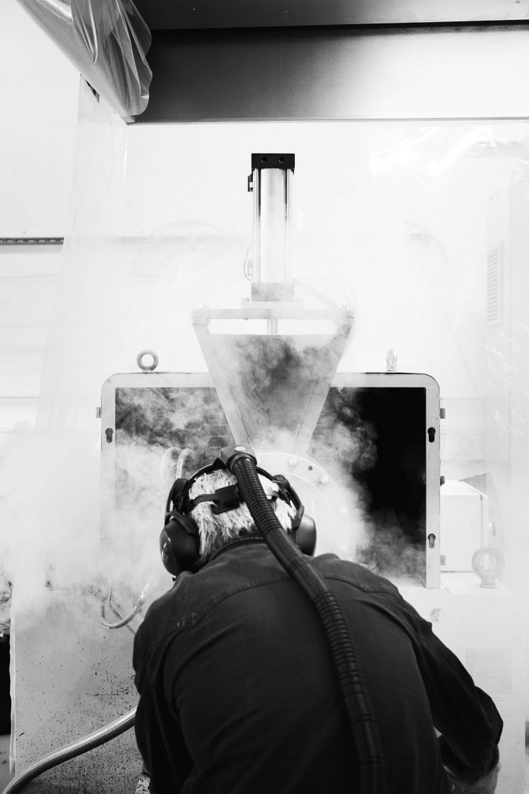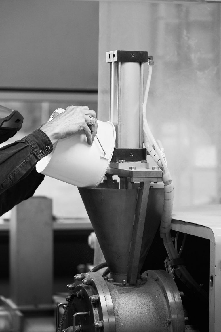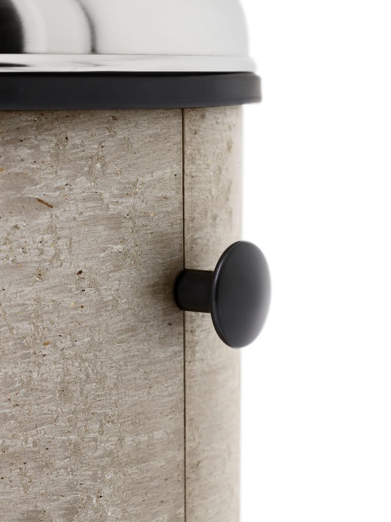 Minden anyag helyből származik az új kukánál. A Vipp kanapégyártásából származó műanyagból és az asztallapgyártásból visszamaradt farostból pasztát készítenek, amit aztán formába préselnek. Az öntött részeket összeragasztják és festetlenül hagyják, egy védőfelület kivételével, hogy látszani hagyják a nyersanyagot.