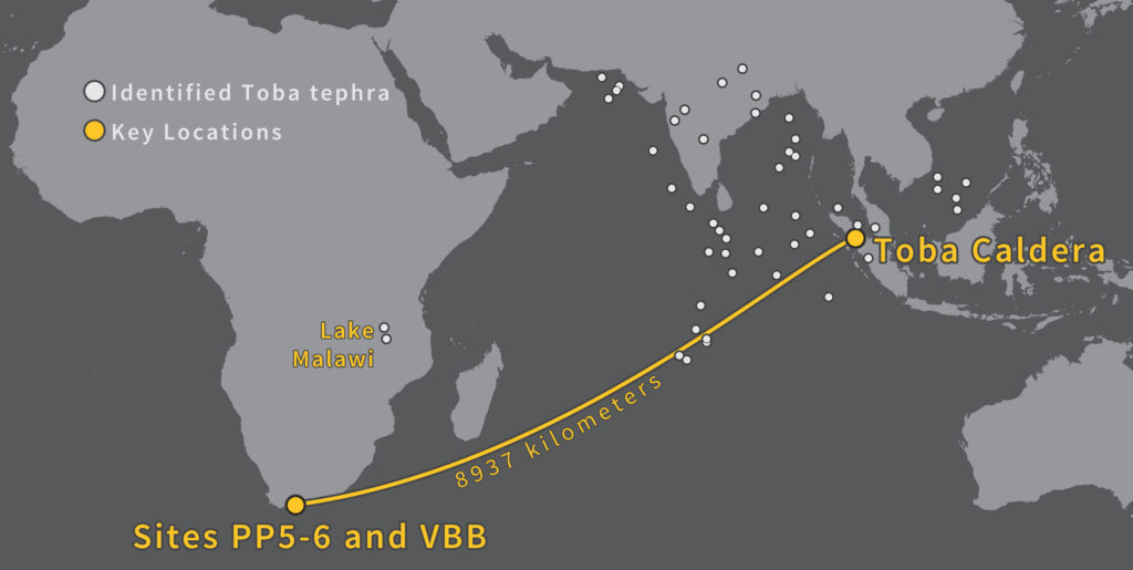 Egy nemzetközi kutatócsoport végzett feltárásokat a modern emberiség bölcsőjének számító Afrika déli partvidékeinél. A kutatók a dél-afrikai ásatásokon apró vulkáni tevékenységből származó üvegszemcséket találtak az üledékes talajban. A kémiai elemzés kimutatta, hogy a szilánkok egyeznek a 9 ezer kilométerrel távolabb fekvő óceániai Toba-kráternél talált szilánkokkal.