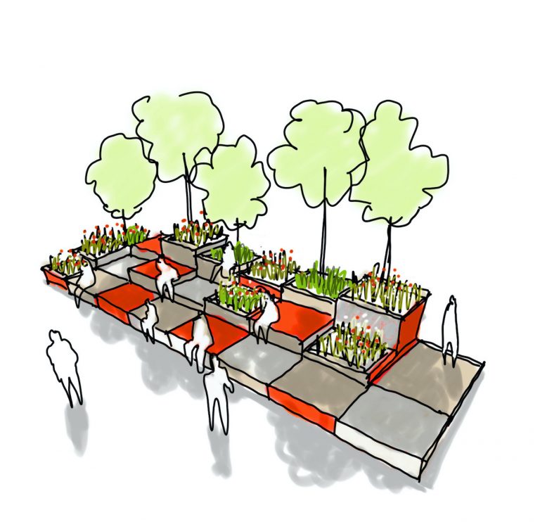 A pixelmodulok a Quartier Latin kulturális intézményeinek fő lépcsőházaira utalnak, befogadnak sok zöldet, maguk is a fesztiválok részévé válnak, de pihenőhellyé is a megfáradt nézelődőknek. Átgondolták a színkódokat is: a szürke illik az épített környezethez, a fehér a modernitást képviseli, a narancs kikacsintás az útburkolati jelek vizuális kódjára.