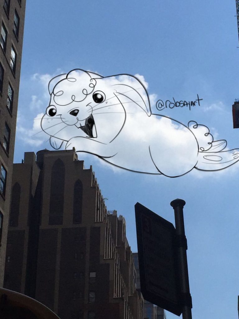 Mondhatjuk, hogy az eget graffitizi szét Rob Sayegh Jr New York-i illusztrátor és játékkészítő. Elmondása szerint mindennapi rutinjában segíti, hogy a felhőkbe lát dolgokat és ezeken a skicceken gyakorol a nagyobb munkák előtt.