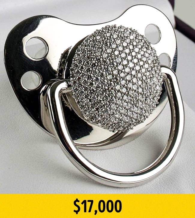 A legdrágább cumi a világon szilikonból készül. Viszont a fogantyúja fehér arany, 280 gyémántos berakással, összesen 17 ezer dollárért, azaz 4,9 millió forintért.