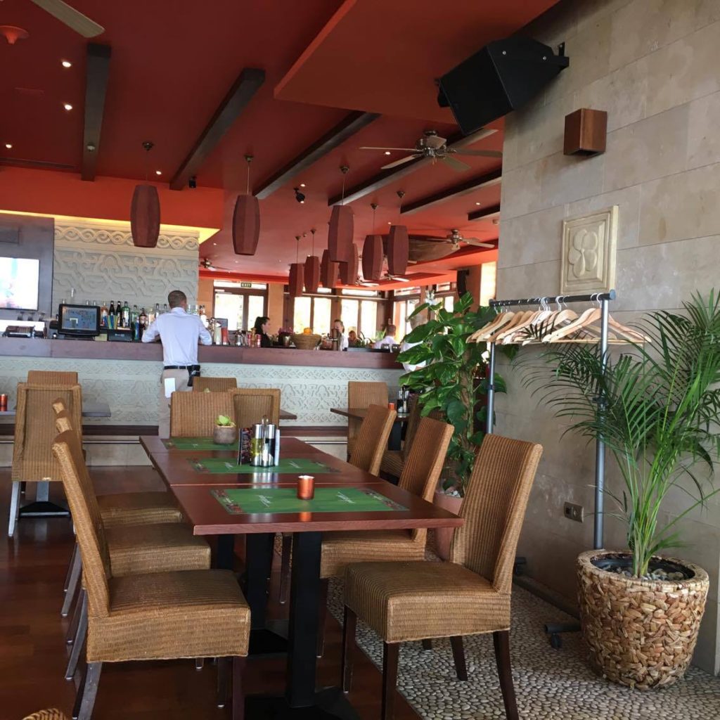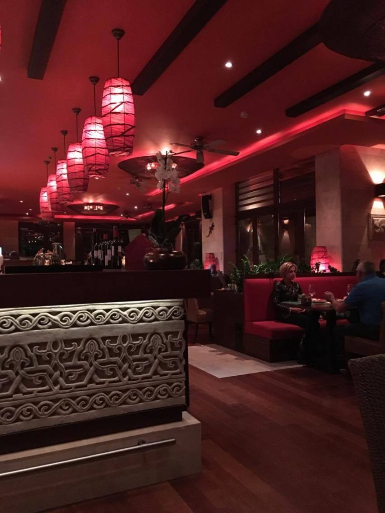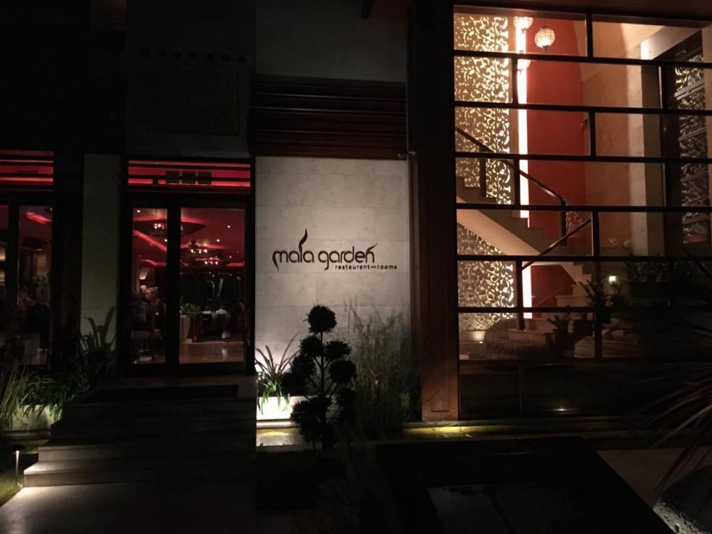 Mivel nem is volt túl messzire a szállásunktól, elhatároztuk, hogy este gyalogosan közelítjük meg a helyszínt, amiről néhány képet már láttunk a neten. Szerencsére egy 20-25 perces séta után meg is találtuk az épületkomplexumot, ami nem csak étteremből, hanem egy igen impozáns hotelből és kávézóból (is) áll. A honlapjuk szerint az épület külső és belső dizájnját Bali szigetének hangulata ihlette. Sajnos mi még nem jártunk Balin, és a hotel részlegről sem tudunk nyilatkozni (talán csak annyit, hogy baromi jó lenne egyszer itt megszállni), ám az étterem stílusa és kialakítása elnyerte a tetszésünket a körülötte futó, aranyhalakkal benépesített vizesárokkal, a Buddha szobrokkal és a megnyugtató narancssárgás fényekkel együtt.