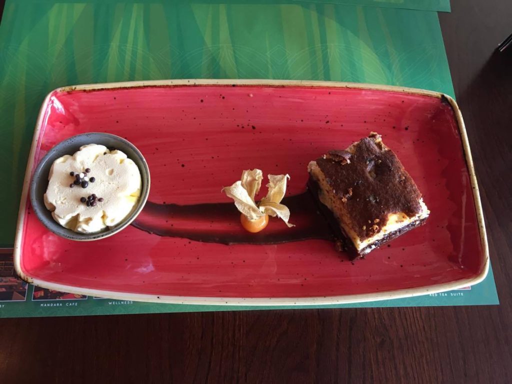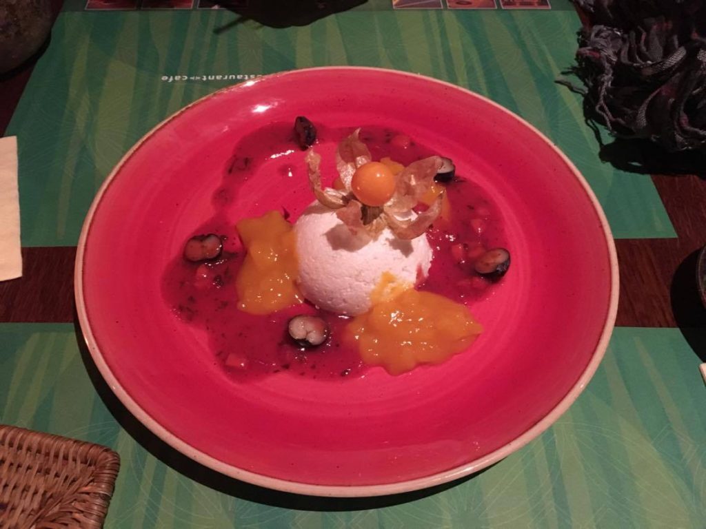 A gyömbéres tejbegríz puding mangó chutney-val és friss gyümölcsökkel, valami egészen elképesztő ízorgiát eredményez a szájban. A mangószósz és a kis gyümölcsdarabkák mellé, mentás szamócaszószt kaptunk még a tányérra, amiért külön hálásak voltunk, a szakácsnak és a Jóistennek egyaránt. Felesleges volna ezt tovább ragozni, mindenkinek meg kellene kóstolnia, egyenesen kötelezővé tennénk mindenki számára!