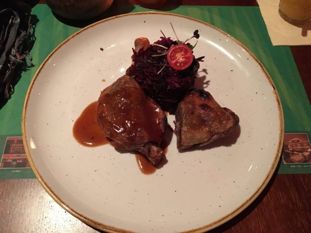 A konfitált kacsacomb, vörösboros párolt lilakáposztával ízben megint csak verhetetlen volt. Nem gondoltam volna, hogy ebben a kategóriában fel lehet venni a versenyt a drága, jó nagyimmal, de ennek itt sikerült. Minden falat azokat az időket juttatta eszembe, amikor kéthetente hétvégenként megérkeztek hozzánk a nagyszülők a kacsasülttel megpakolt szatyrokkal és nyál csorgatva gyűlt a család az asztal köré. Mivel azonban ez sem volt egy eget rengető adag (és persze baromi éhesen érkeztünk) maradt még egy kis hely a bendőben a desszertnek.