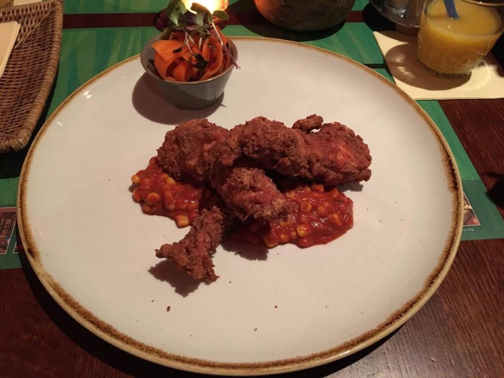 A ropogós bundába bújtatott tandoori csirke tényleg zseniálisan hozta a tőle várható keleti ízvilágot, amihez a kukorica salsa és a korianderes répasaláta hibátlanul asszisztált. Az egyetlen dolog, ami kifogásolható ezzel a fogással kapcsolatban, az a mérete. A hús mennyisége még oké (ha nem te vagy Fekete László), ám a köretből elfért volna még egyszer ennyi ezen a szép nagy kerek tányéron.