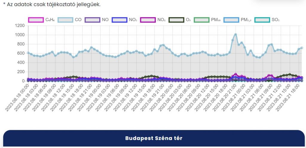 A met.hu légszennyezettség-figyelőjében remekül látszik, hogy huszadikán este, mit tesz isten, elég szépet ugrott a CO és a NOx mennyisége a levegőben, Budapesten, a Széna téri mérőpontnál: