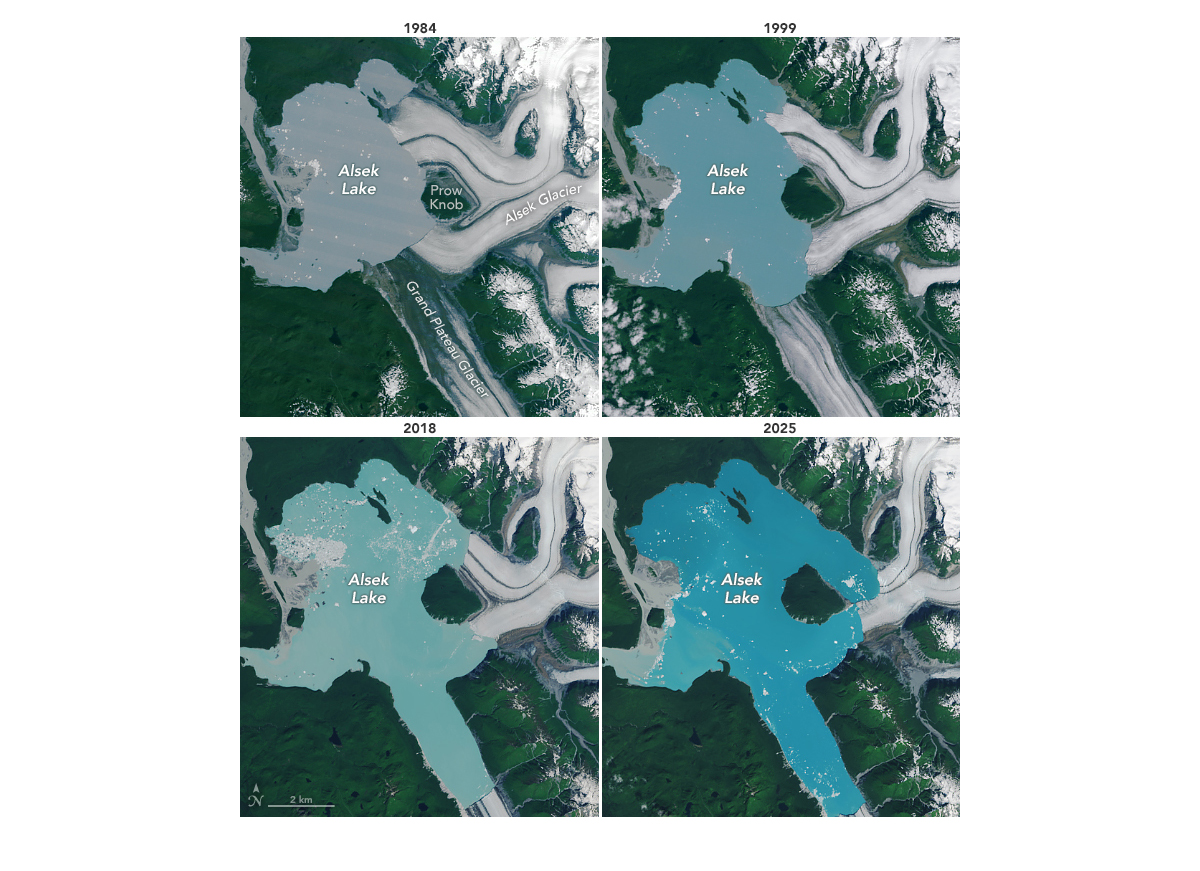 Alaszka délkeleti részén a klímaváltozás hatására egy új sziget jelent meg. A NASA Landsat 9 műholdjának augusztusi felvételein jól látható, Prow Knob elnevezésű sziget valójában egy hegy (csúcsa), ami egy kristálytiszta, édesvizű tó közepén tör a felszínre, amit a felmelegedés hatására olvadó Alsek-gleccser hagyott maga után: