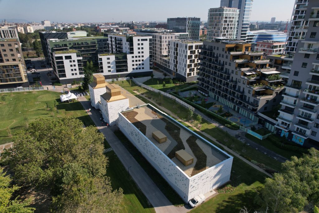 Ez nemes cél, de a BudaPartot felkereső átlagember jó eséllyel az építmény külsejét nézi majd meg alaposabban, nem véletlenül: mintegy ötezer porcelán- és üvegszigetelő díszíti a falait, körülötte szánkódomb, kutyafuttató, illetve közösségi kert épült a környéken élők számára. Az épület tetejére 252 négyzetméteren, speciális növényzetből álló zöldtetőt is telepítettek.
