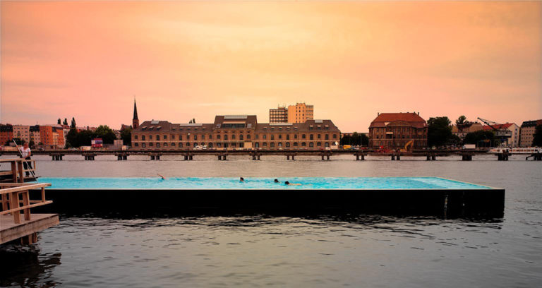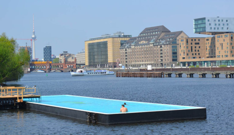 A berlini Badeschiff vízen lebegő medencéje egy 2002-es pályázat eredményeként valósult meg. Ez a 32 méter hosszú medence körülbelül 2 méteres legnagyobb vízmélységével a Spree folyón lebeg és nyilvános minden napozni, úszni és pihenni vágyónak.