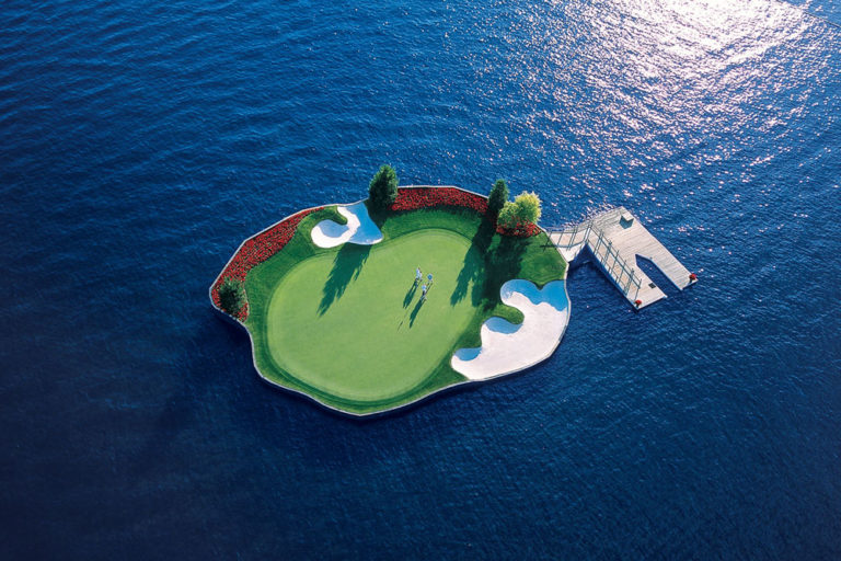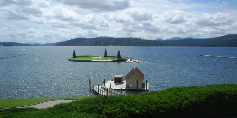 Az idahoi Coeur d’Alene Resort golfpályája önmagában is szemrevaló, de különösen figyelemre méltó a 14. lyuk, ami egy mesterséges szigeten található. Ezt a szigetet bizony sosem találod ugyanazon a helyen, mert folyamatosan mozgásban van.
