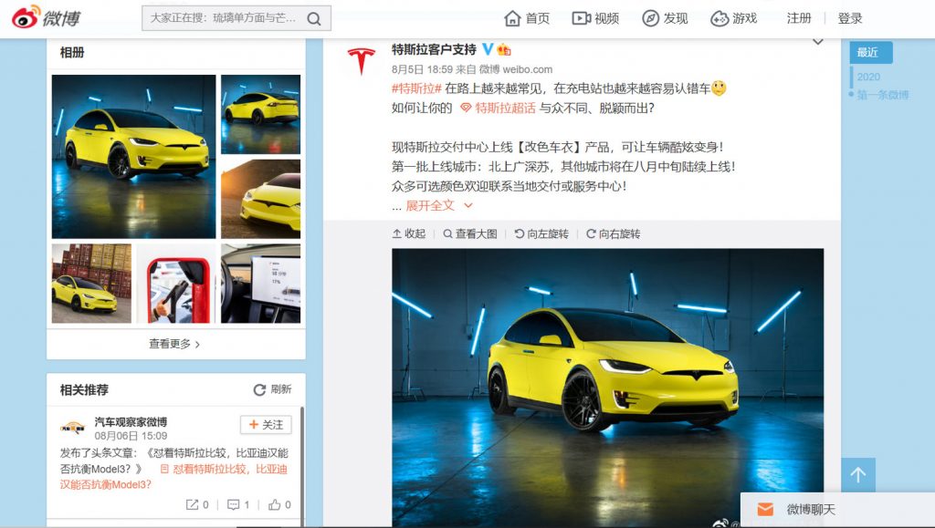 A Twitter kínai belpiaci megfelelőjének számító Weibón kihirdetett új lehetőség szerint a kínai teslások augusztus közepétől több nagyvárosban (Peking, Sanghaj, Guangzhou, Sencsen, Suzhou) hivatalosan, a kapcsolatot a helyi kereskedéssel felvéve adhatnak új színt autójuknak.