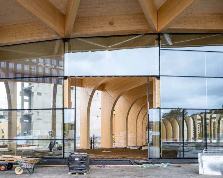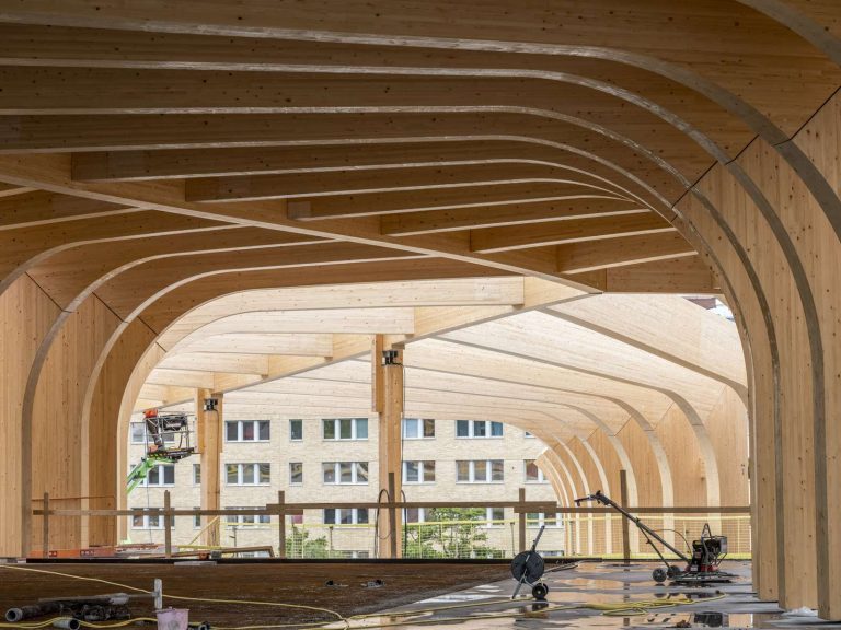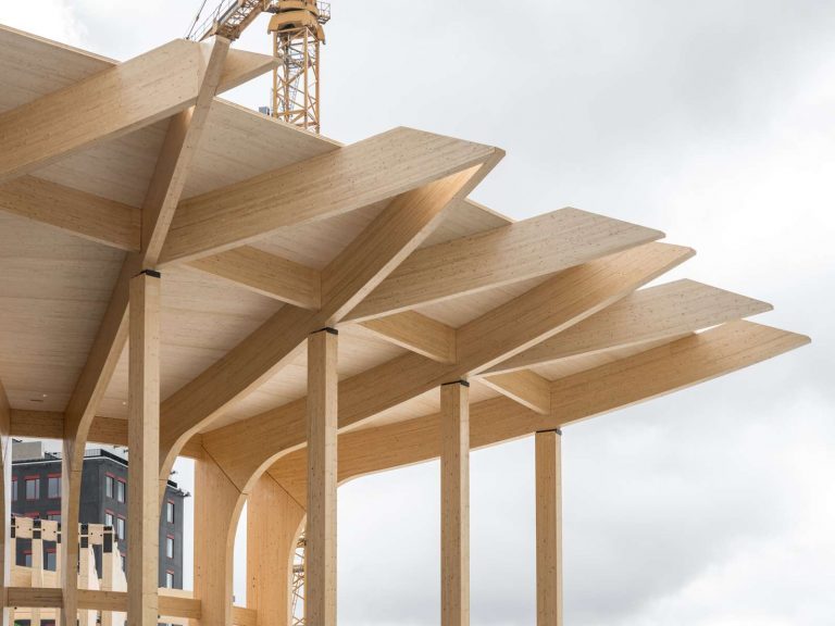 Különös módon a fa egyszerre az egyik legelőremutatóbb és leghagyományosabb része az építkezésnek. A faépítésnek óriási tradíciói vannak Svédországban, azonban esetünkben határozottan modern megközelítést alkalmaznak. A gerendák és oszlopok több rétegből álló, előre méretezett ragasztott faanyagból épülnek, és tartós, nedvességálló szerkezeti ragasztóval kötik össze azokat. A számítógép-vezérelt gyártás lehetővé teszi az ívelt ragasztott gerendadarabok nagy pontosságú vágását. A szerkezet merevségét és folytonosságát a faelemek belsejében elrejthető fémcsatlakozók biztosítják. A padlólemez helyi fából készített CLT lesz majd – illetve részben már most is az, miután az építkezés igen jól áll.