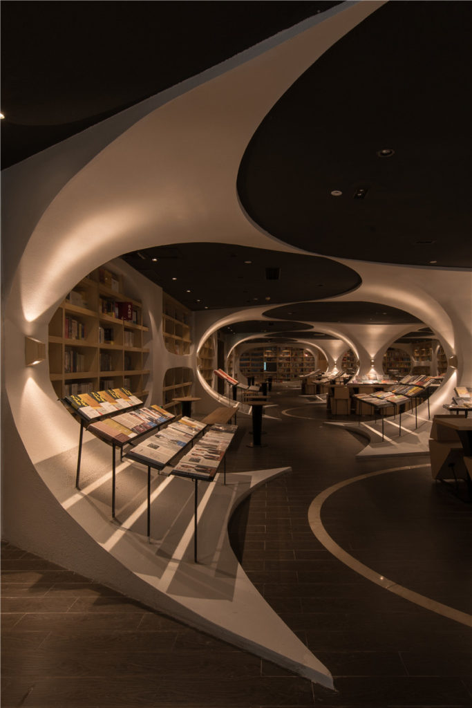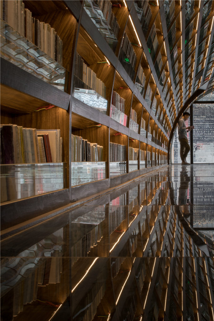 Ez a lenyűgöző könyvtár a Yangzhou Chongshuge, és a Shanghai XL-Muse nevű építésziroda nevéhez köthető. Ahogy az ember besétál az épületbe, rögtön olyan érzése támad, mintha egy hatalmas alagútban állna, a padlót pedig mintha víz borítaná.