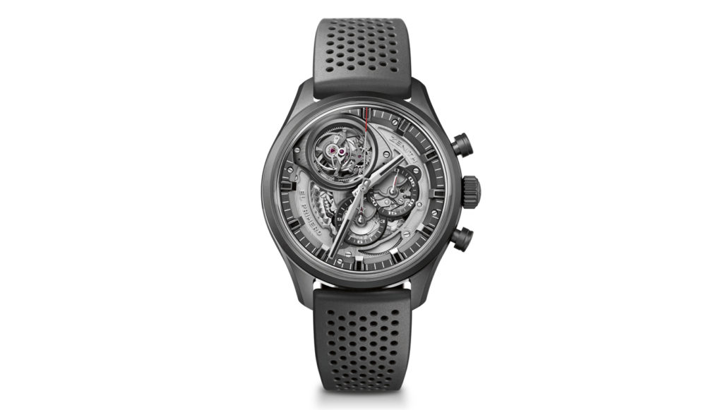 A nyitott, betekintést engedélyező, háromdimenziós számlap nagyban meghatározza az óra sportosan elegáns stílusát. Erre erősít rá a hozzá tartozó, perforált, fekete gumiszíj is, ami egyértelműen a vintage autóversenyek korára utal - ezt a sportágat egyébként nemrégiben el is kezdte támogatni a Zenith.