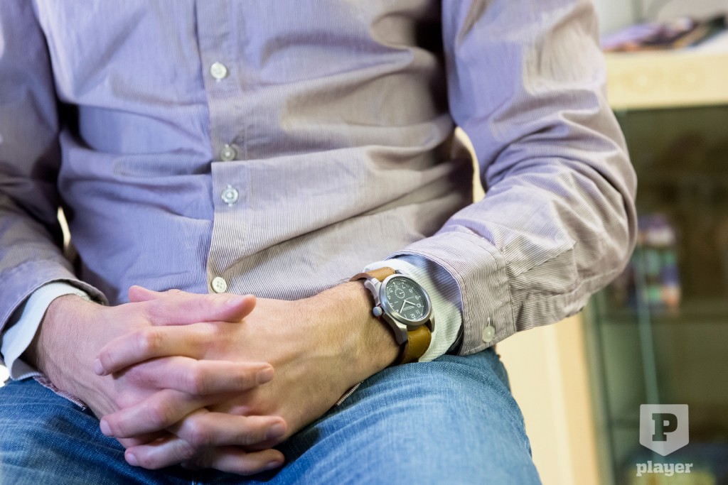 – Ez egy magasabb kategóriájú japán kvarcszerkezet – folytatja Zsolt –, maga az óra pedig egy strapabíró masszív darab. Az óraház titániumból készült, egy darabból. Az üveg süllyesztett, van benne egy másodpercmutató is, 100 méterig vízálló. Mivel ez egy úgynevezett field watch, van benne némi military beütés, és a tankvezetéstől a favágásig bármihez passzolható. Van hozzá paracord szíj, ami szinté elég trendi mostanában. De sok NATO-szíjas modell is van.
