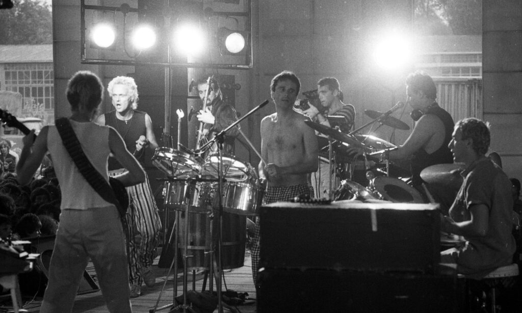Balatonfüred, de nem az Anna-bál, hanem a Magyar Hajó- és Darugyár Balatonfüredi Gyáregységének üzemcsarnokában megrendezett újhullámos együttesek fesztiválja. A színpadon a Rolls Frakció: csíkos nadrágban D. Nagy Lajos (ének), Tóth Csaba (gitár), Trunkos András (basszusgitár), Tóth Miklós (orgona), Óbert Tibor (dob), Donászy Tibor (dob). A dátum 1982. augusztus 7. (Fotó: Fortepan/Urbán Tamás)