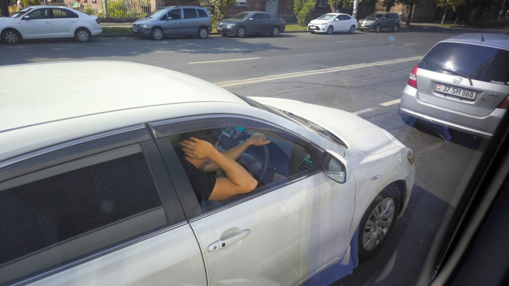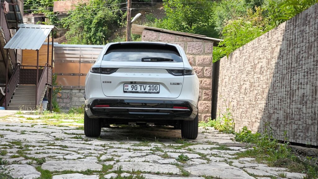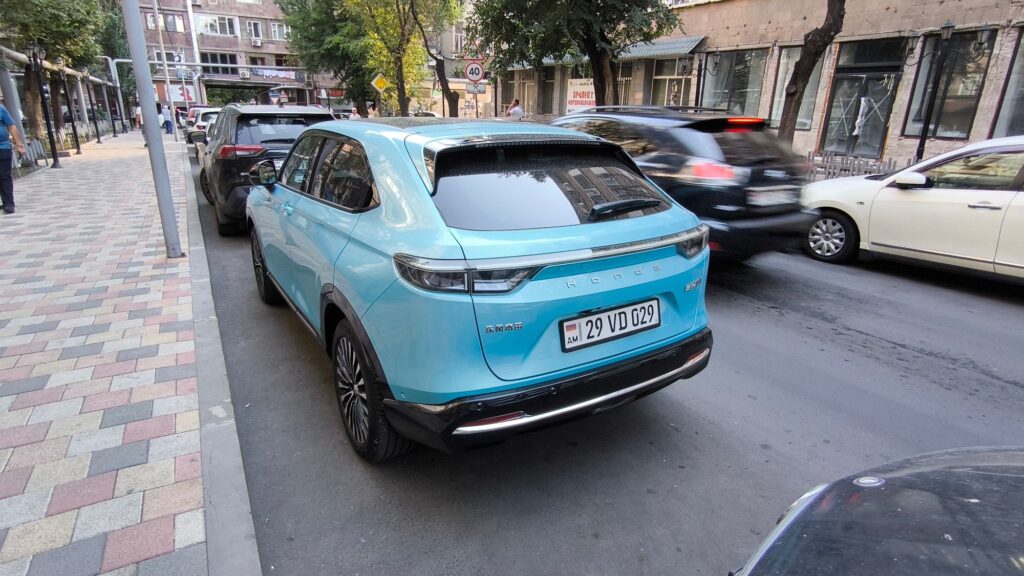Nagyon sok a villanyautó, de főleg Jerevánban használják őket, mert a vidéki hegyi utakon hamar lemerül az akku. Ennek ellenére ez pont egy vidéki Honda e:Ny1, japán feliratokkal