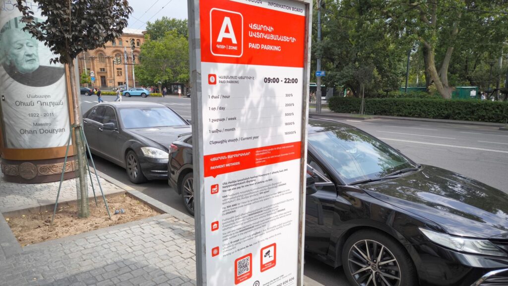 Parkolási tarifák a kevés fizetős várakozóövezet egyikében Jerevánban: egy óra 300, egy nap 2000 dram, ami kábé ugyanannyi forint