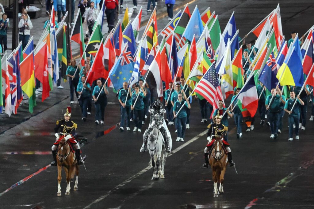 Floriane Issert, az Országos Csendőrség csendőr altisztje lovagol, mögötte önkéntesek viszik a csapatok zászlóit