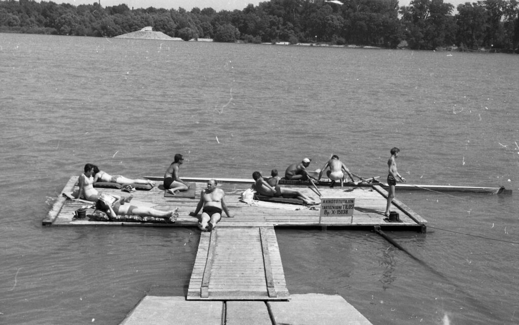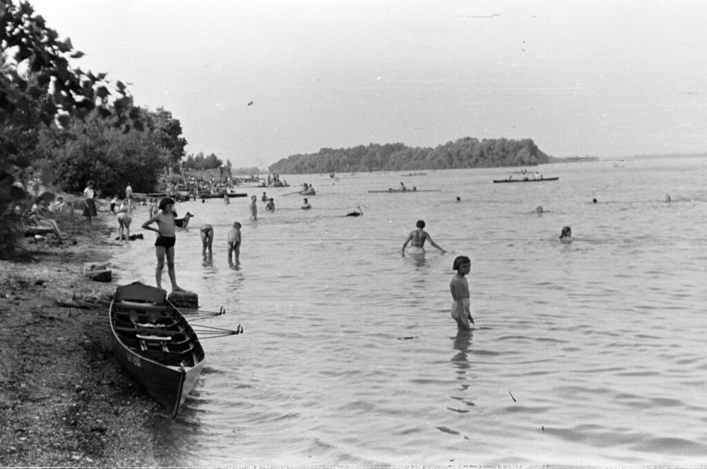 „A kikötőtutajon tartózkodni tilos!” felirat iránt közömbös strandolók a Rómain 1967-ben (Fotó: Fortepan/Magyar Rendőr)