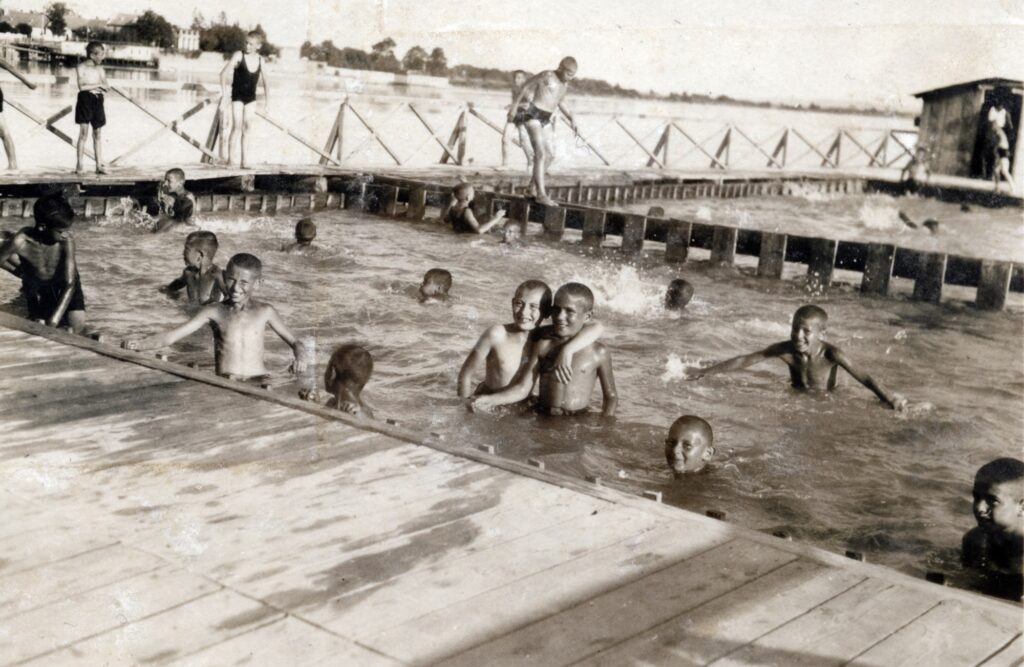 Fürdő a Dunán 1921-ben, a pontos helyszín nem ismert. A képen jól látszik a fürdő felépítése: gyakorlatilag egy Dunán úszó famedence, amelyet a Duna vize tölt fel, de mivel a medence oldala és alja is lécekből állt, kisebb volt a sodrás (Fotó: Fortepan/Lugosi Szilvia)