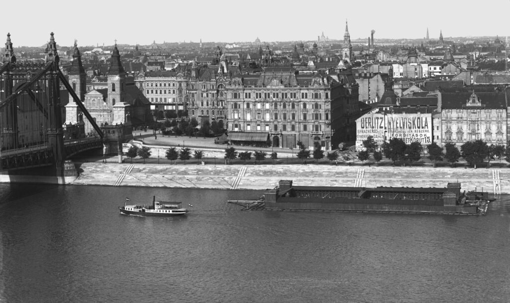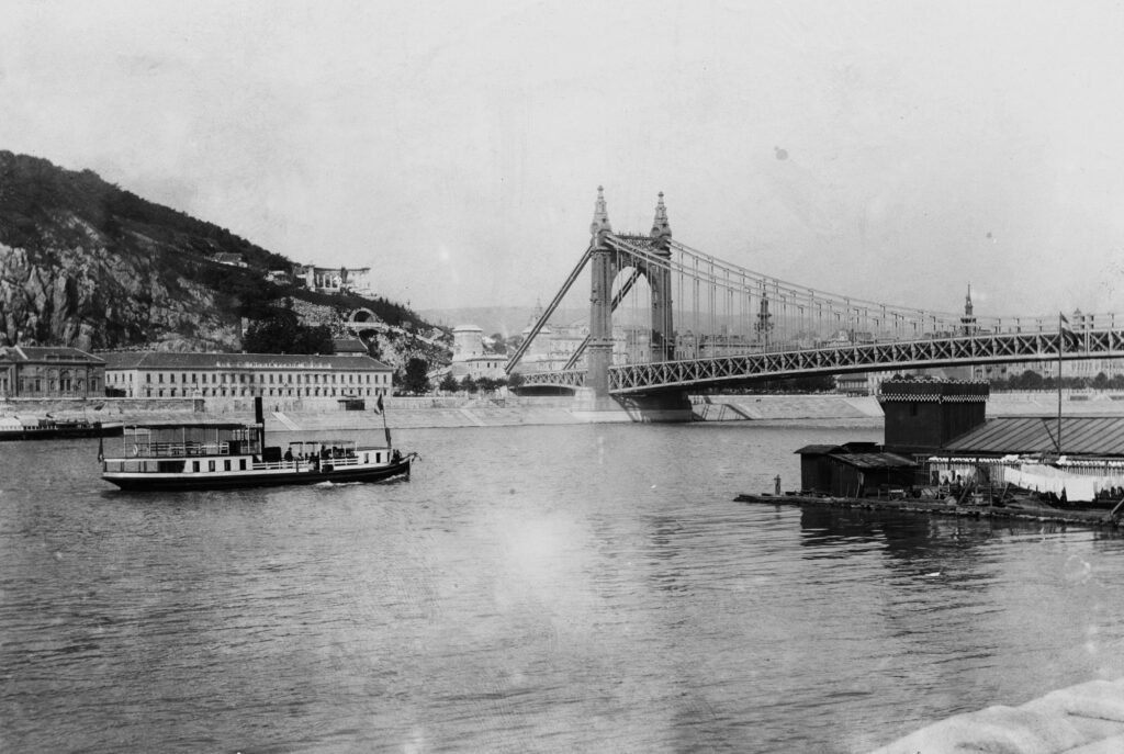 Megy a gőzös a Dunán 1905-ben, háttérben az Erzsébet híd, a túlparton a Rudas fürdő és a Gellért-hegy oldalában a Szent Gellért szobor a vízesés felett. A kép jobb szélén egy dunai fürdő (Fotó: Fortepan/Deutsche Fotothek/Brück und Sohn)