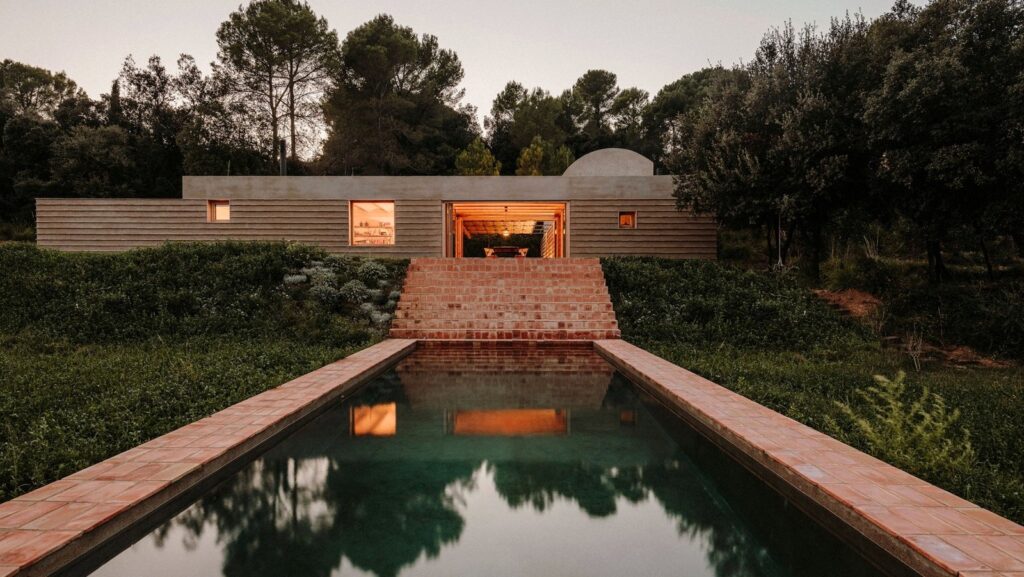 A Mesura építészeti stúdió vizuálisan összekapcsolta a házat a saját medencéjével egy egységes, terrakotta árnyalatú betonból és cseréplapokból álló terasszal és lépcsősorral. De a csempék nemcsak a lépcsőket, hanem a medencét is szegélyezik, hogy olyan legyen az egész, mintha kifolyna a házból.