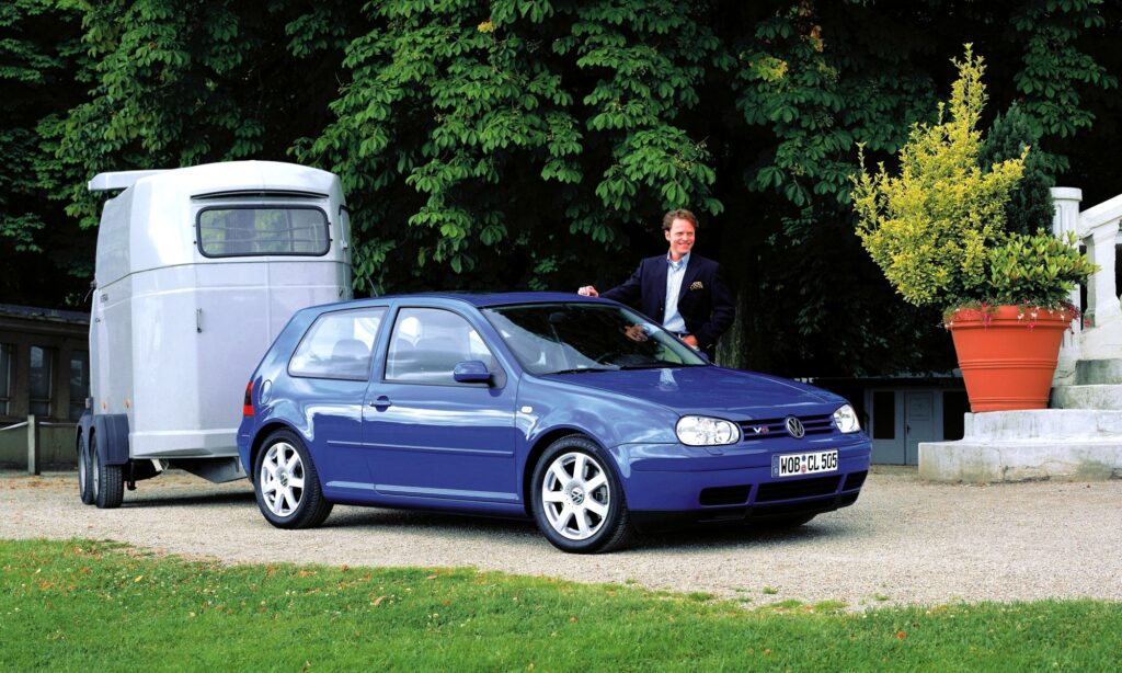 Egészen furcsán mutat egy háromajtós Golf mögött a lószállító tréler, de ez itt nem egy 1.4 fapad, hanem egy újabb bizonyíték Piëch mérnöki őrületére. Ebben az autóban ugyanis egy 2,8 literes, szűk hengerszögű hathengeres motor van (VR6) és összkerekes (4motion). Mert a négyes Golfból ilyen is volt, szövetüléses vagy bőrkárpitos, meg öthengeres, meg R32-es, szóval minden kombináció lehetséges volt.