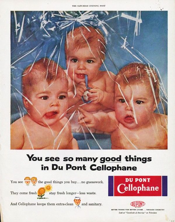 Mit tehetünk, ha a biztonságos borotvának köszönhetően van egy vagy több arcszőrzet nélküli csecsemőnk? A Du Pont Cellophane reklámja szerint a jónak tűnő megoldás: celofánba kell csomagolni.