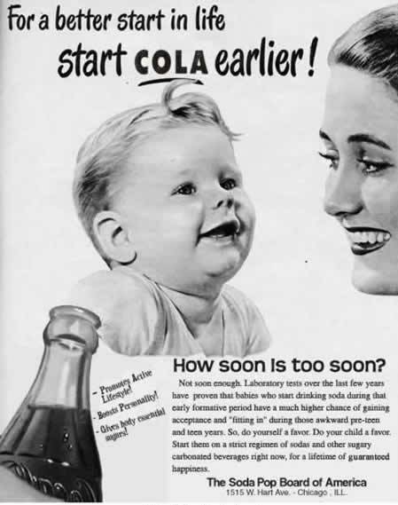 Még mindig a gyerekeknél maradva: fontos, hogy minél előbb rászoktassuk őket a szénsavas üdítőkre. A reklám szerint a kisgyerekkorban fogyasztott kóla élethosszig tartó boldogságot okoz, a 7up-hirdetés pedig javasolja az anyatejet az üdítővel keverni.