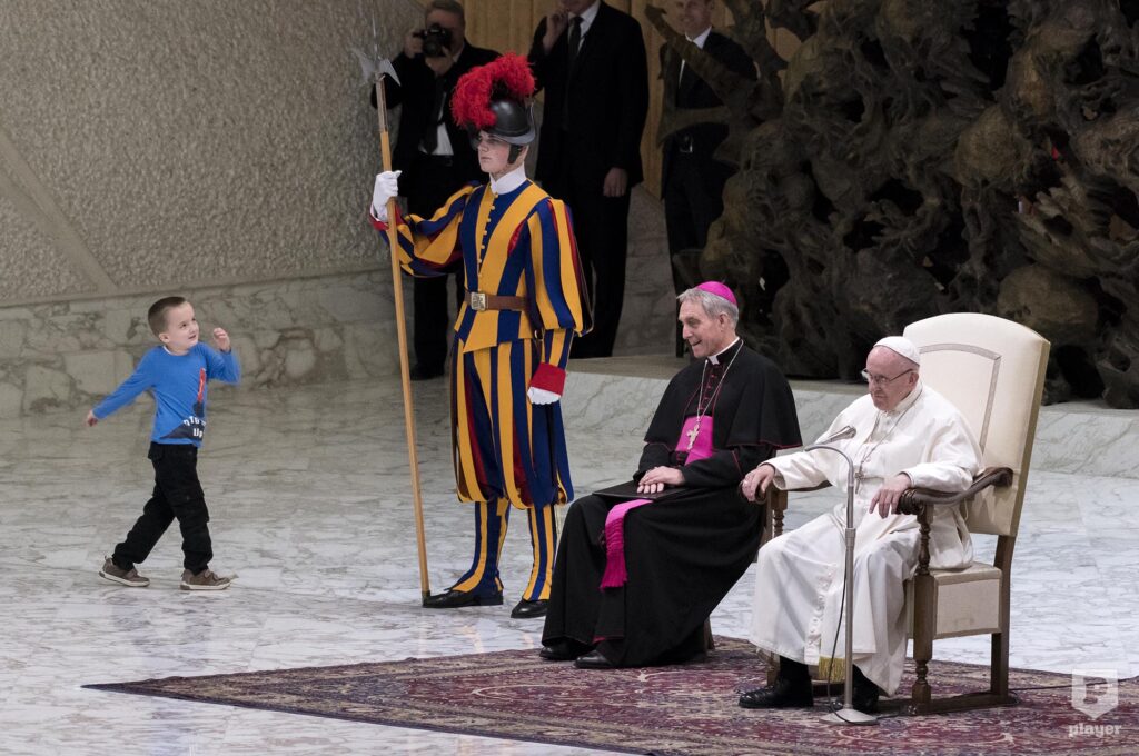 Az egyik szokásos vatikáni audienciáján egy hatéves kisfiú szakította félbe Ferenc pápa beszédét, amikor felment a színpadra, és ellopta a show-t, körülnézett, és megráncigálta egy kicsit a pápát védő svájci gárdista egyenruháját. Ferenc pápa jót mosolygott, és példaként állította mindenki elé a kisfiút, aki Argentínából érkezett az édesanyjával, és beszédzavara ellenére is ki tudta fejezni magát.