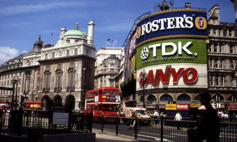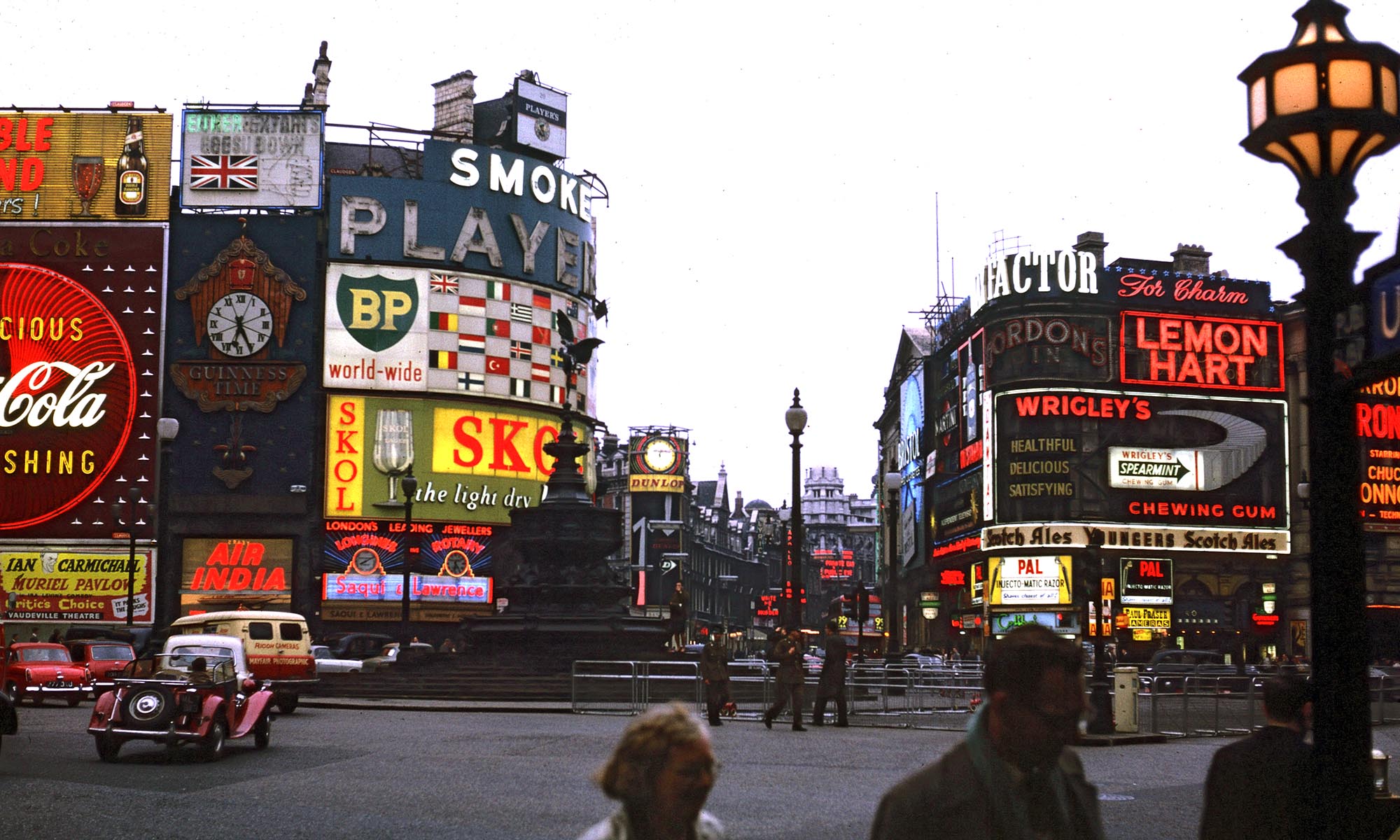 A Piccadilly Circus az ikonikus reklámfallal 1962-ben és 1992-ben