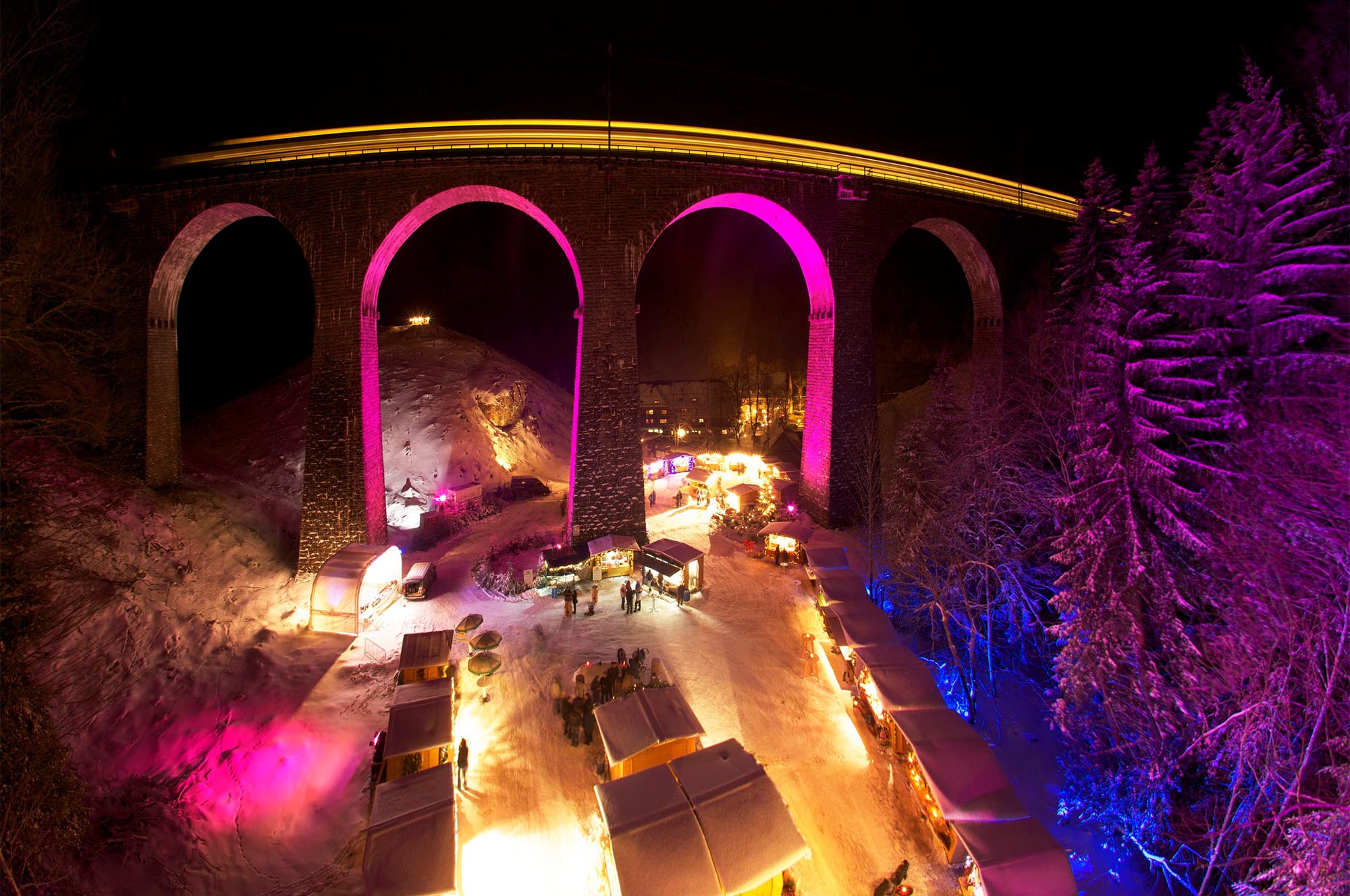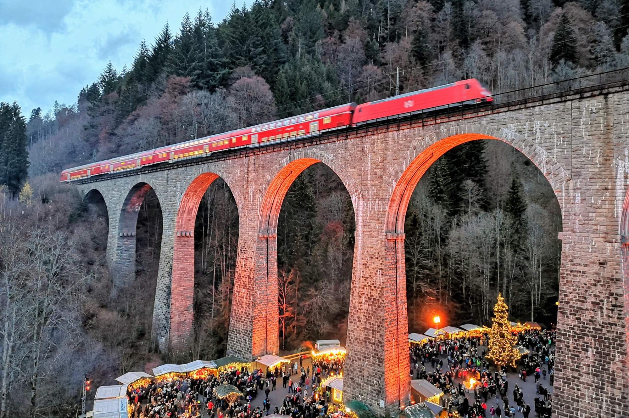 Mintha egy dark fantasy film díszlete lenne, pedig a Fekete-erdő mélyén, a pokol völgyének is nevezett Ravenna-szurdokban van egy karácsonyi vásár, amit egy negyven méter magas, karácsonyi díszbe öltözött, kivilágított viadukt alatt tartanak.