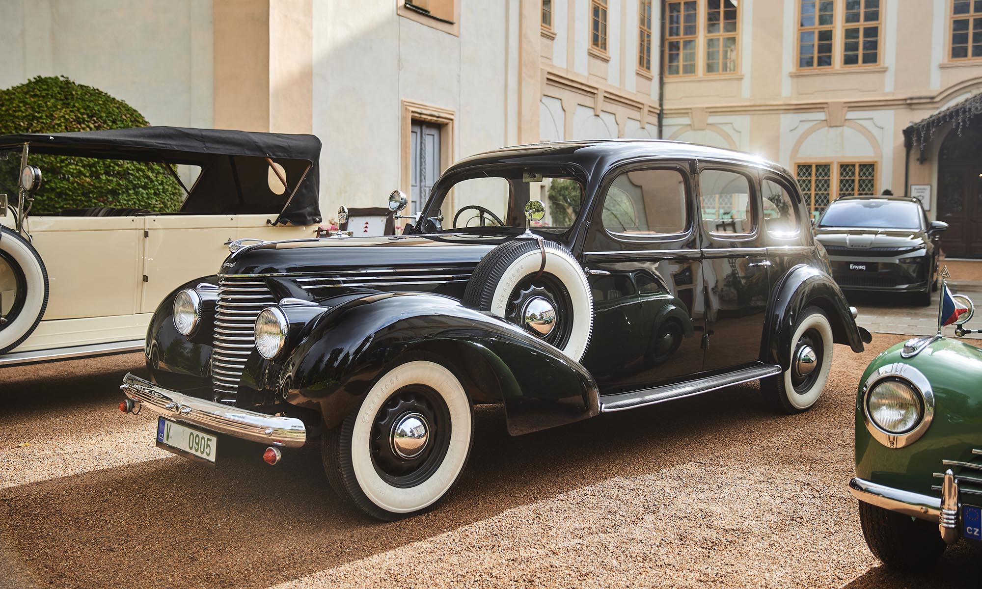 A kastély előtt pedig olyan autók sorakoztak fel, amiket akár a birtok egykori tulajdonosai is használhattak. Ott volt például a Škoda elődjének számító Laurin & Klement első autója, a Voiturette A, amit 1905-ben gyártottak. Mai szemmel megmosolyogtatók az adatai, hiszen a kéthengeres motorja mindössze 7 lóerős, amivel 40 km/órás sebességet ért el, de mivel ez a jármű nemcsak első pillantásra tűnik egy ló nélküli hintónak, ezért ez a tempó is szédítőnek hatott akkoriban. Az öt fennmaradt példány egyike a gyári múzeumból jött, és bár vezetni ezt nem tudtuk, időnként pöfögött egy vidám kört az udvarban.