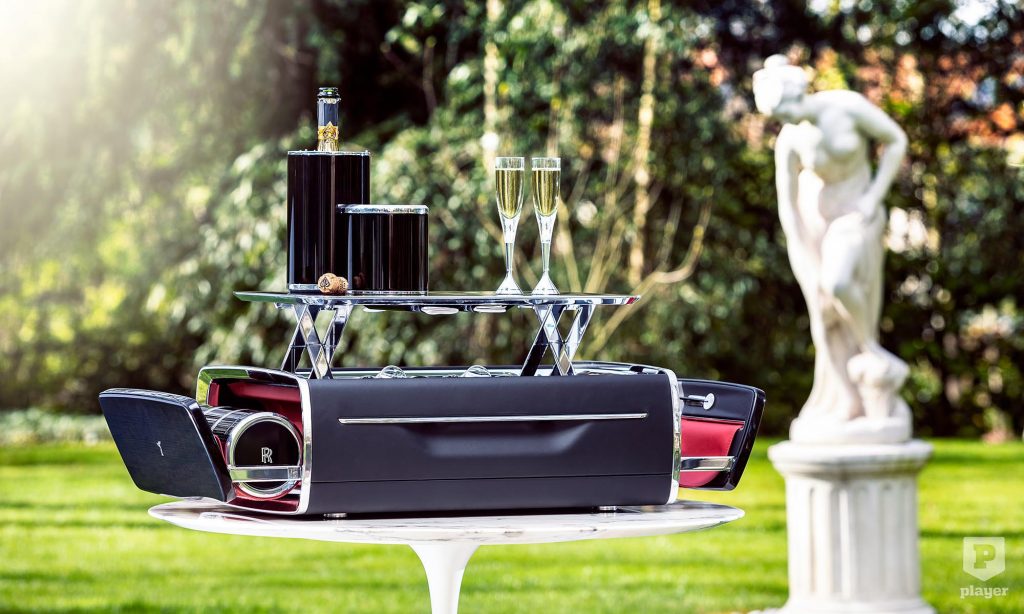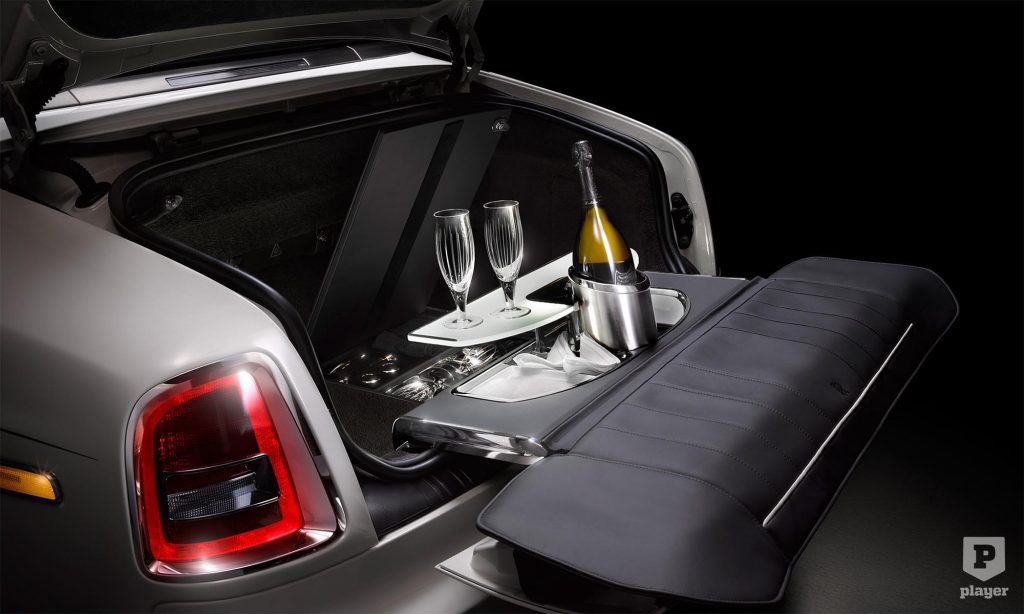 A pezsgőhűtő eleve opció a Rolls-Royce limuzinjánál, de a Phantom csomagterébe olyan készlet rendelhető, amivel bárhol lehet kerti partit tartani. Az alumíniumból és szénszálas anyagból készült pezsgősláda hidegen tartja az italt, gombnyomásra tölgyfa asztalka nyílik belőle.