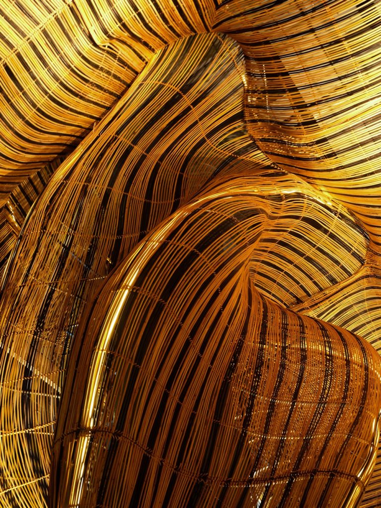 A természetes, megújuló rattan beépül a 30 méter magas térbe, és ráadásul az üvegfalaknak köszönhetően kintről is jól látszik. További különlegessége, hogy az aranyszínűre festett, szabadon áramló folyadék geometriáját idéző rattan az aranyló sört idézi, amint épp egy pohárba töltik. Kell ennél jobb design egy bárnak?