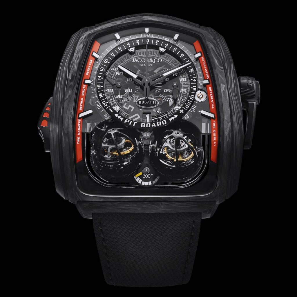 ami átlépte az óránként 300 mérföldes sebességet, a számlapon lévő Bugatti-embléma és 300+ felirat nem is hagy kétséget felőle. Az óra tokja szénszálas anyagból és titániumból készült, a grafitszürke és piros szín is a rekorddöntésre épült szuperautót idézi.