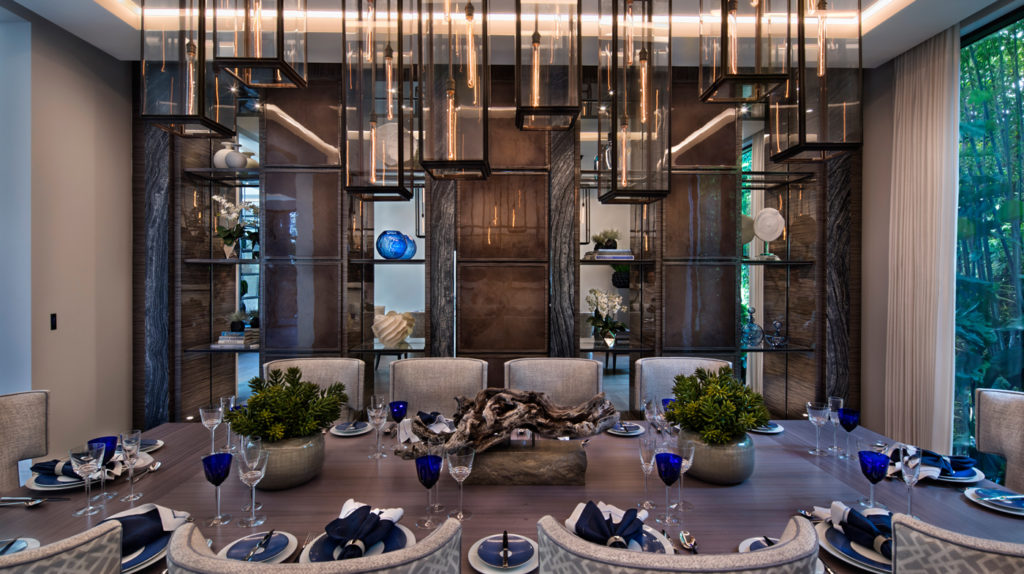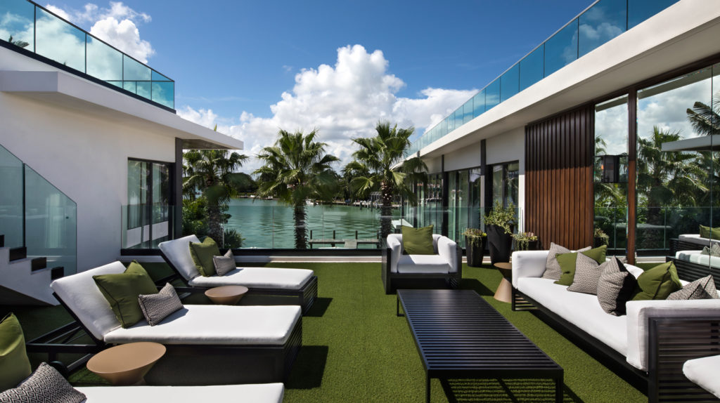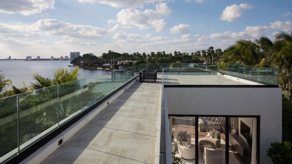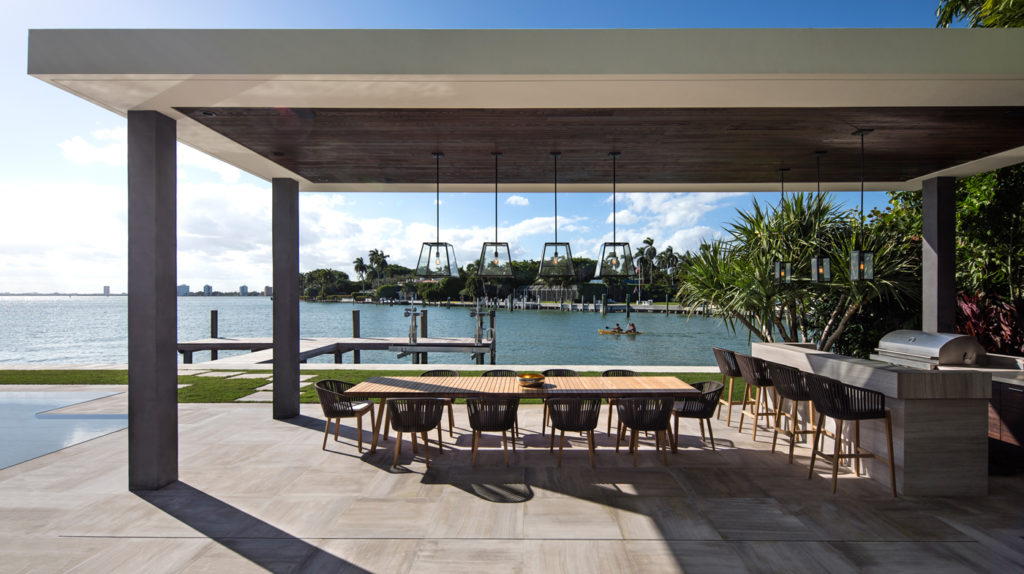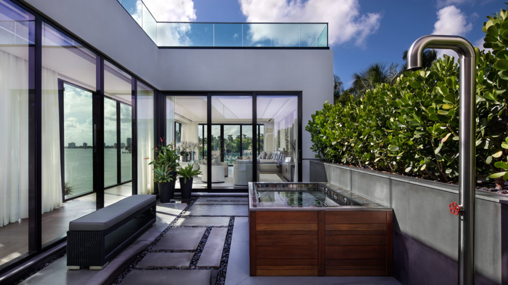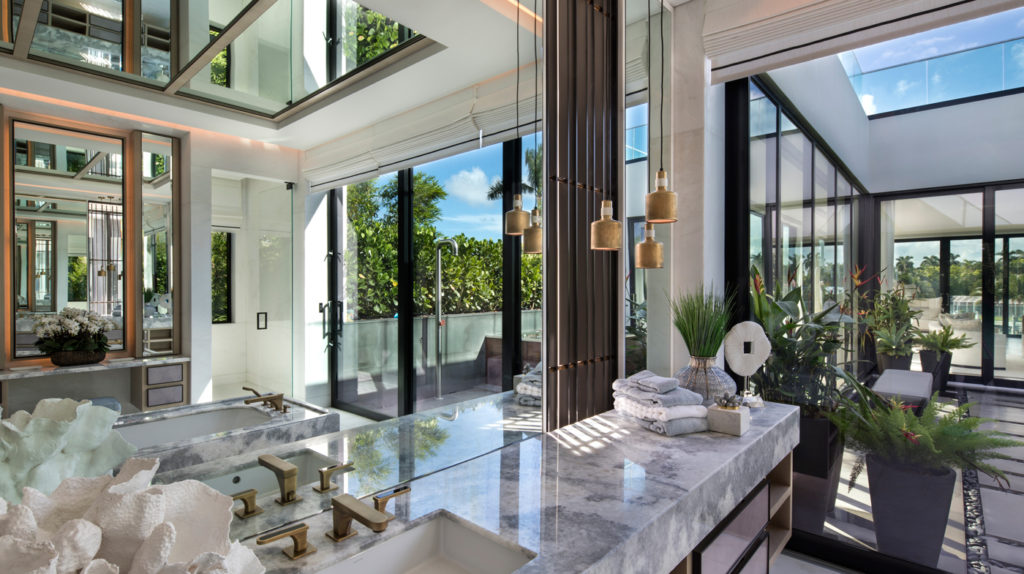A hatalmas üvegpanelek biztosítják a természetes fényt, míg a pálmafák, a medence és a Biscayne-öböl közelsége trópusi hangulatot garantálnak.