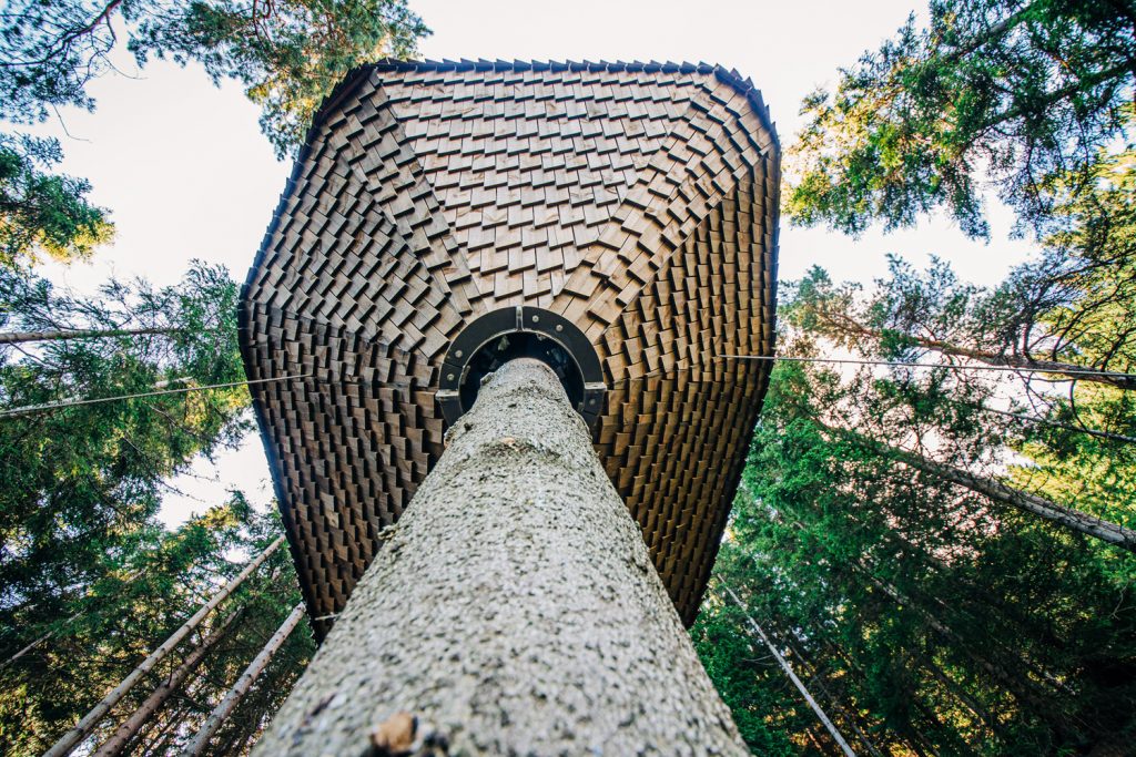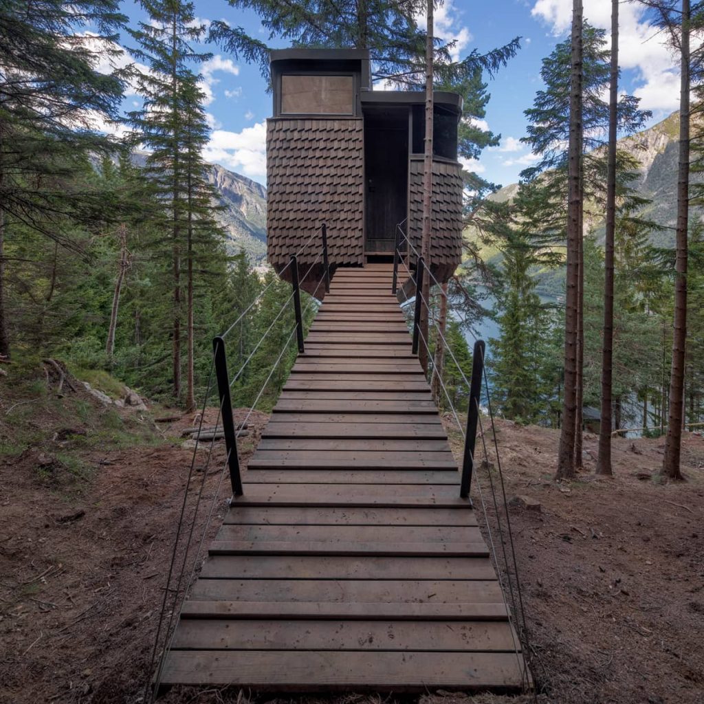 Ez nem egy fantáziakép, hanem a valóság! A 6 méterrel a talajszint felett felfüggesztett lombhotel egy fa törzse köré van kialakítva, és négy ember befogadására képes. Fürdőszoba, konyhasarok és nappali is van benne  A faházhoz egy kis fahídon keresztül jutunk el. A Helen & Hard építészstúdió által tervezett tér létrehozásának célja az volt, hogy valóban megmutassa, mit jelent a természetben lakni.