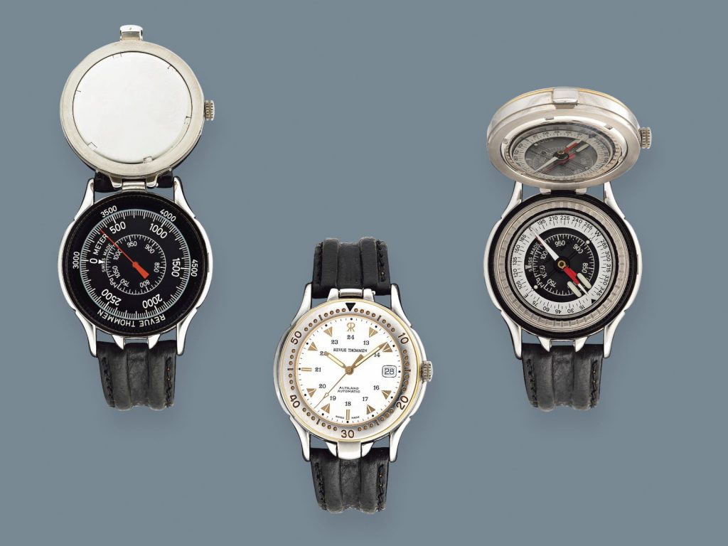Az 1853-ban, Svájcban alapított Revue Thommen óramanufaktúrától mérnöki csúcsteljesítménye, az Altiland. A 3in1 óra felnyitható számlapja alatt egy mechanikus magasságmérő található, a tokba ezen felül egy iránytűt is be lehet helyezni, így az tájolóként is használható.
