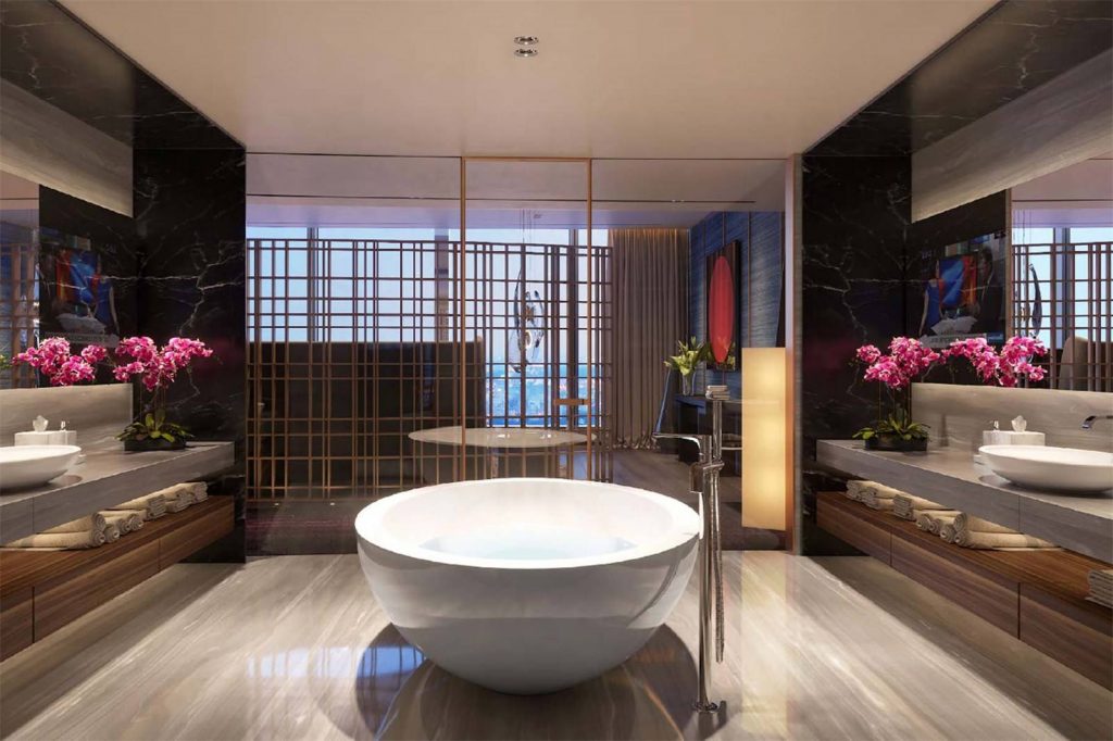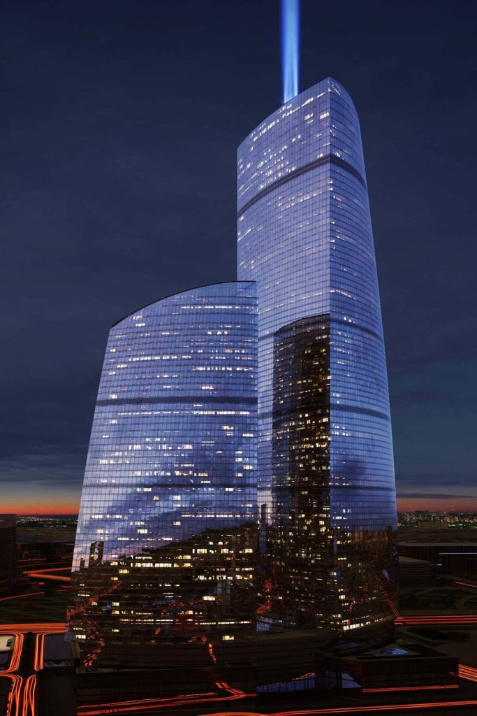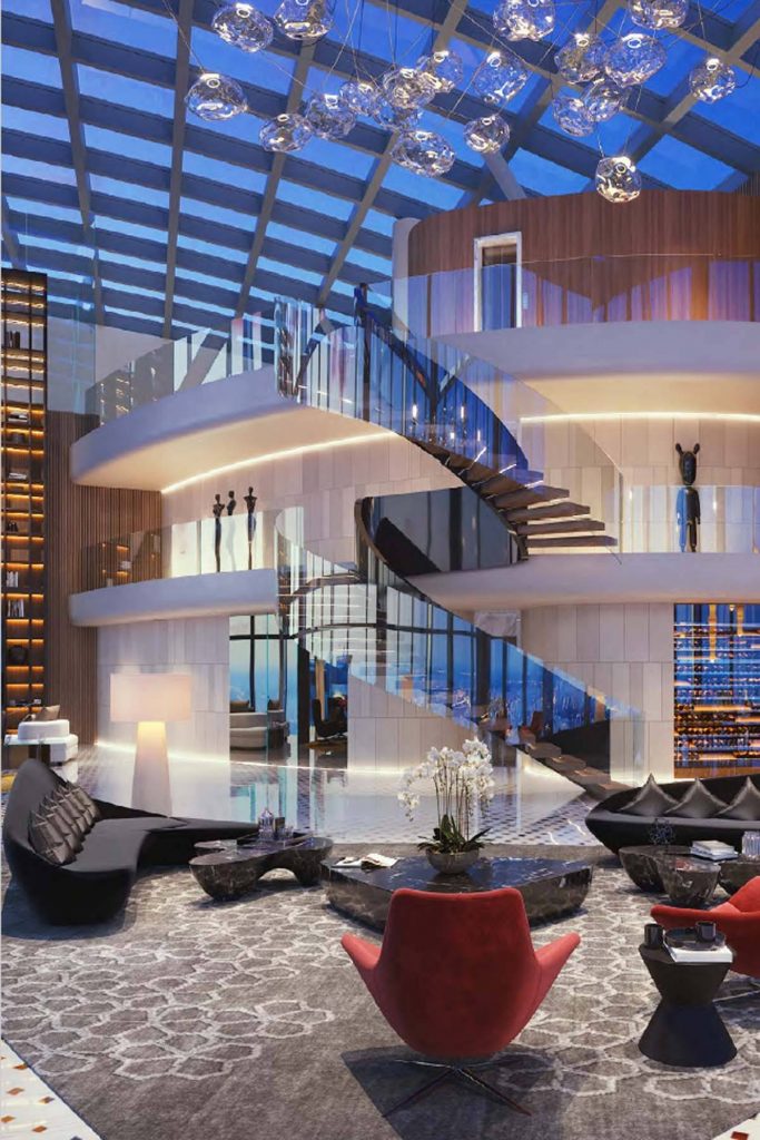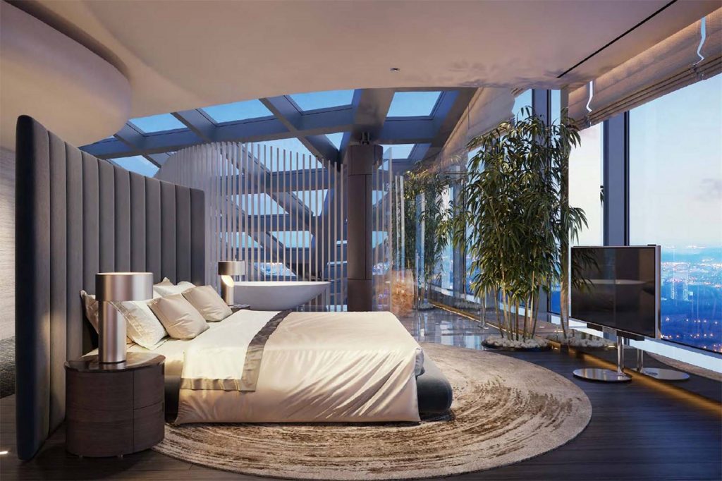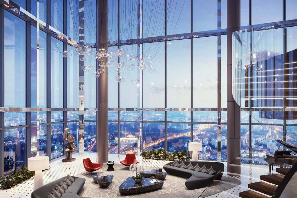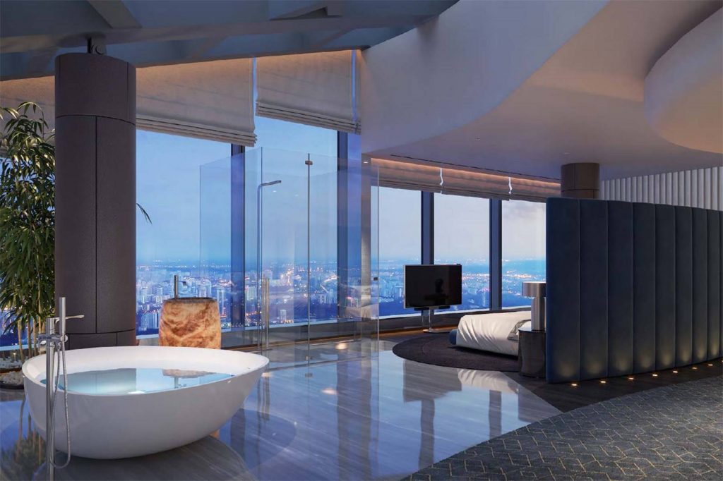 A Moszkva folyó partján épült Föderáció Torony kisebbike 374 méteres és 101 szintes, ebben kínálnak egy 95-96-97. emeleten fekvő ingatlant (a magasabb, keleti torony egyébként 450 méteres). Az alsó szint 1300, a középső 431, a felső 450 négyzetméteres, ami 2181 négyzetméterre jön ki. Elég jól hangzik, főleg, ha tudod, hogy a lakás gyakorlatilag egy üvegkupolában van, helyenként öt méter magas ablakokkal és 14 méteres belmagassággal.