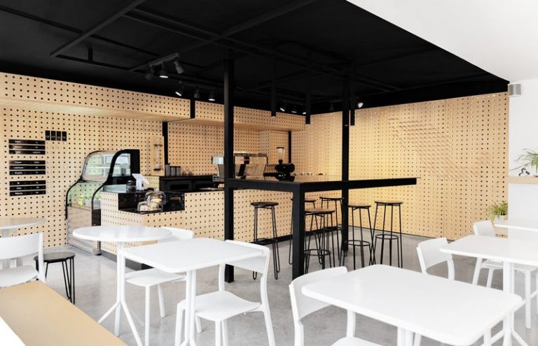 A tejeskávé színeire és a pegboard falakra épít ez a menő kávézó.
